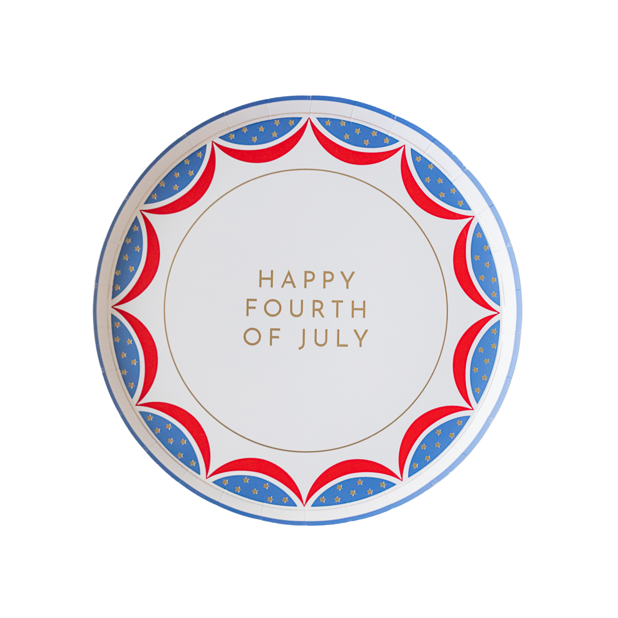 Happy 4th Of July Dessert Plates this Independence Day! Adorned with gold foil stars and patriotic red, white, and blue designs, these Fourth of July small plates are a must-have for your summer celebration!