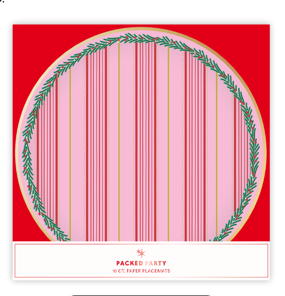 Add a festive pop to your table with these 15" round paper placemats! Featuring a cheerful pink and red stripe pattern with gold accents and a green garland border, they bring a playful holiday twist to any setting. Perfect for parties, brunches, or gift wrapping stations. Pack of 10.