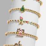 - Includes 5 bracelets, each with one of the following charms in the center: a Santa Claus, a Christmas tree, a gingerbread man, a gingerbread house, and a reindeer