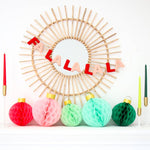 Set of 7 large lightbulbs in rainbow colors with gold glitter tops. Honeycombs measure 8” and 10” in length. Some assembly required comes with string to string up. Comes in a cute box for retail display.