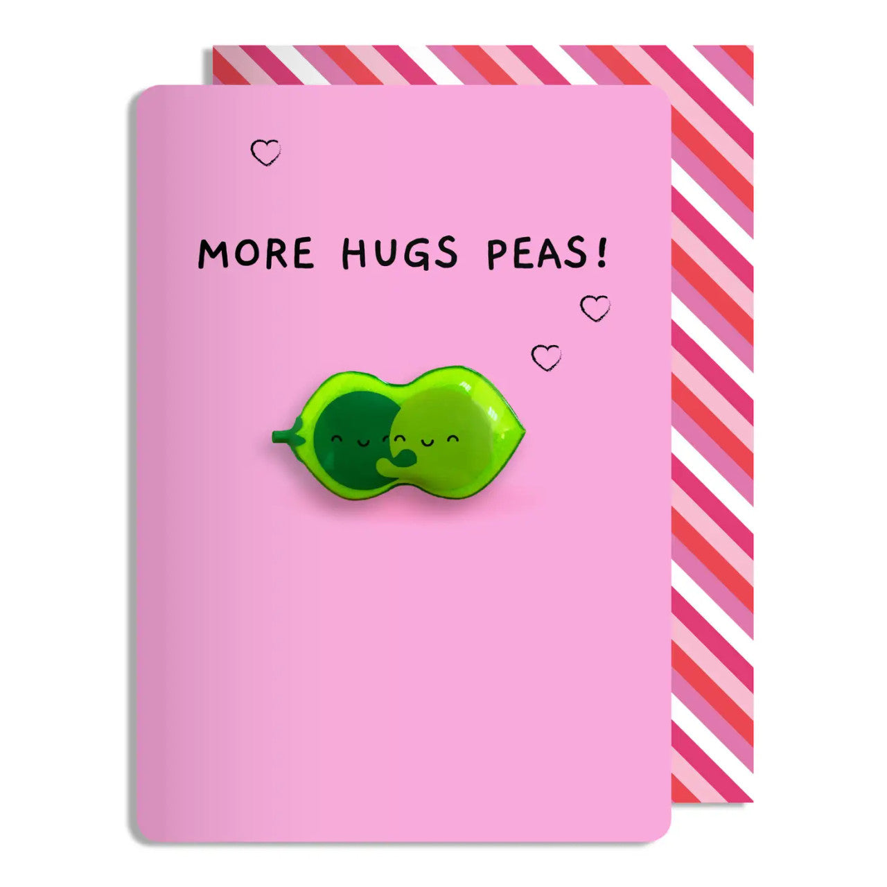 This fun card measures 12 x 17cm. The card is made of FSC uncoated board, and the envelope is printed in a bespoke stripy envelope. There is a removable pvc magnet in a pea design.
