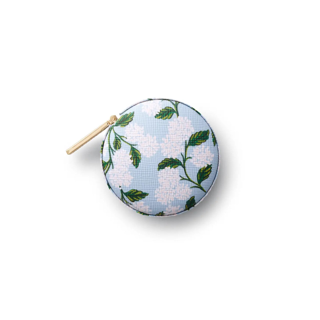 This retractable measuring tape is housed in an illustrated case with brass hardware and a hidden button release. Keep this handy tool in your sewing box, at your desk, or in your purse. The tape measures 60 inches or 152.4 centimeters. DETAILS - 2.25" L × 2.25" W - Textured PU with metal hardware - Printed in full color - 5 foot retractable tape - Wipe clean