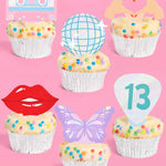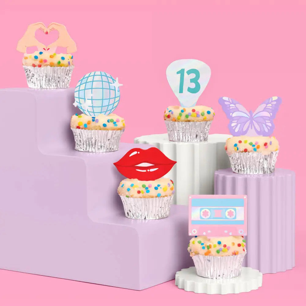 It's me, hi || These are the cutest toppers, everyone agrees. Whatever era you're celebrating, do it with these dessert toppers! 24 cardstock dessert toppers - 6 total designs w. 4 each 4 disco balls, 4 lips, 4 butterflies, 4 cassettes, 4 guitar picks + 4 heart hand symbols Full color and iridescent foil details