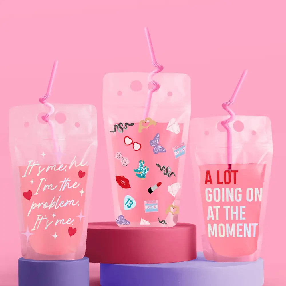It's me, hi || These are the cutest sippers, everyone agrees. Whatever era you're celebrating, do it with these drink pouches! Fits 15oz of your favorite bev - no need to refill constantly! 15 pouches total: 5 pcs per design w. iridescent foil Comes with 15 light pink twisty straws