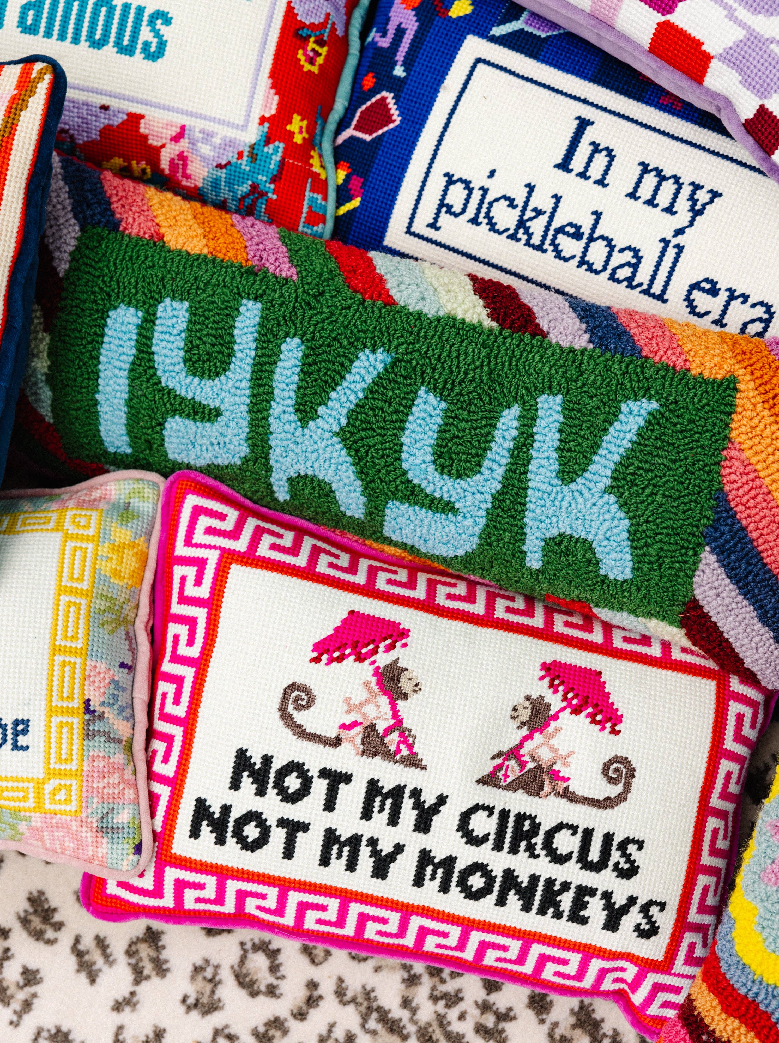 Dare to mix with our scalloped linen, contrast trim velvet, ruffled block print, and needlepoint pillows for an insta-worthy pillow pile.