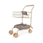 Shopping cart for tiny shoppers designed with pivoting front wheels that make it easy to steer.