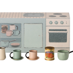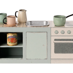 The small kitchen counter comes with 2 cups and 2 plates, a pot and a pitcher and a small can. The small sink is made of metal to look as real as possible. It fits perfectly into the kitchen in the SuitCasa mouse house.