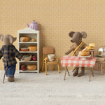 Mum mouse in light brown body fabric. She wears a dress and a bag with cheese holes. This mouse fits furniture and accessories in size mouse. Buy more clothes separately, clothes in size mum/dad fits this mouse.