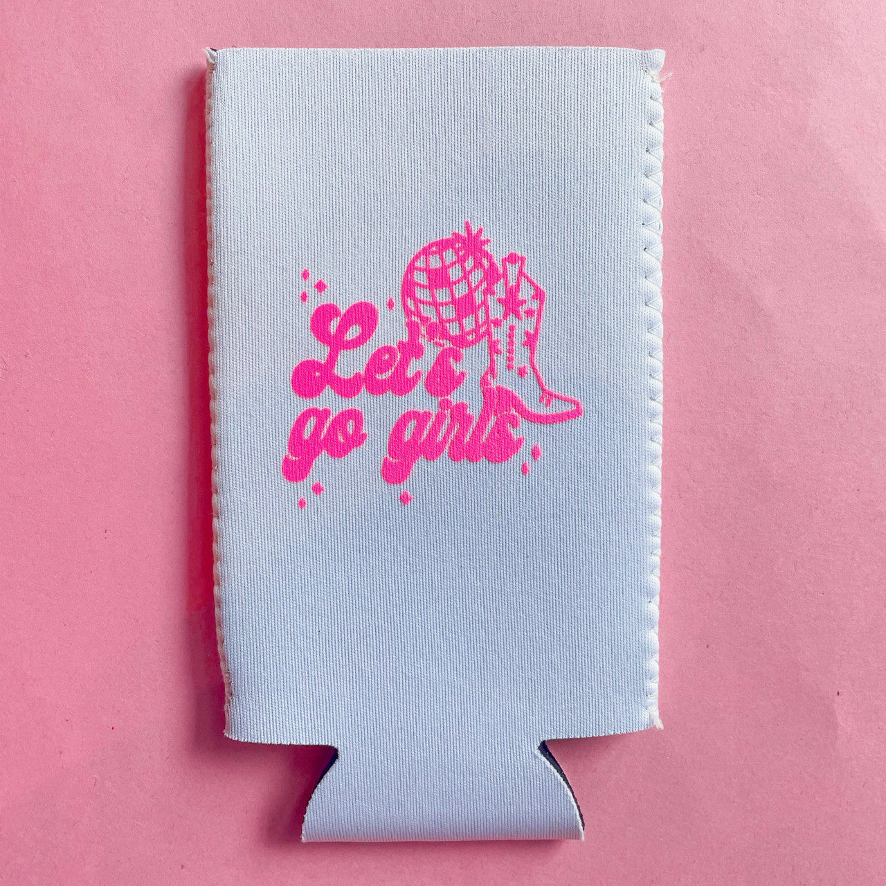 Bring on the fun with these disco cowgirl drink koozies. Perfect for a day at the beach or getting together with your girls for a bachelorette party! One neoprene white koozie with neon pink image Fits any SLIM 12oz can Screen printed Double-sided