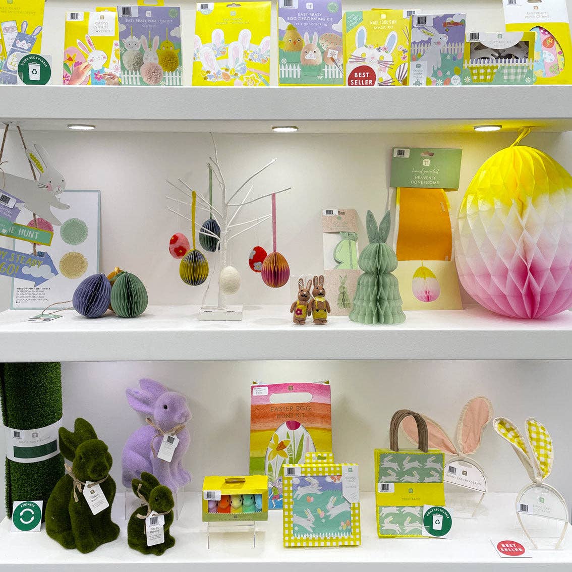 Merchandise with other Easter decorations like honeycombs and ornaments but these bunnies also work well as table decoration, turning an ordinary Sunday dinner table into a an Easter spectacle, so display with paper and reusable tableware to inspire your customers.