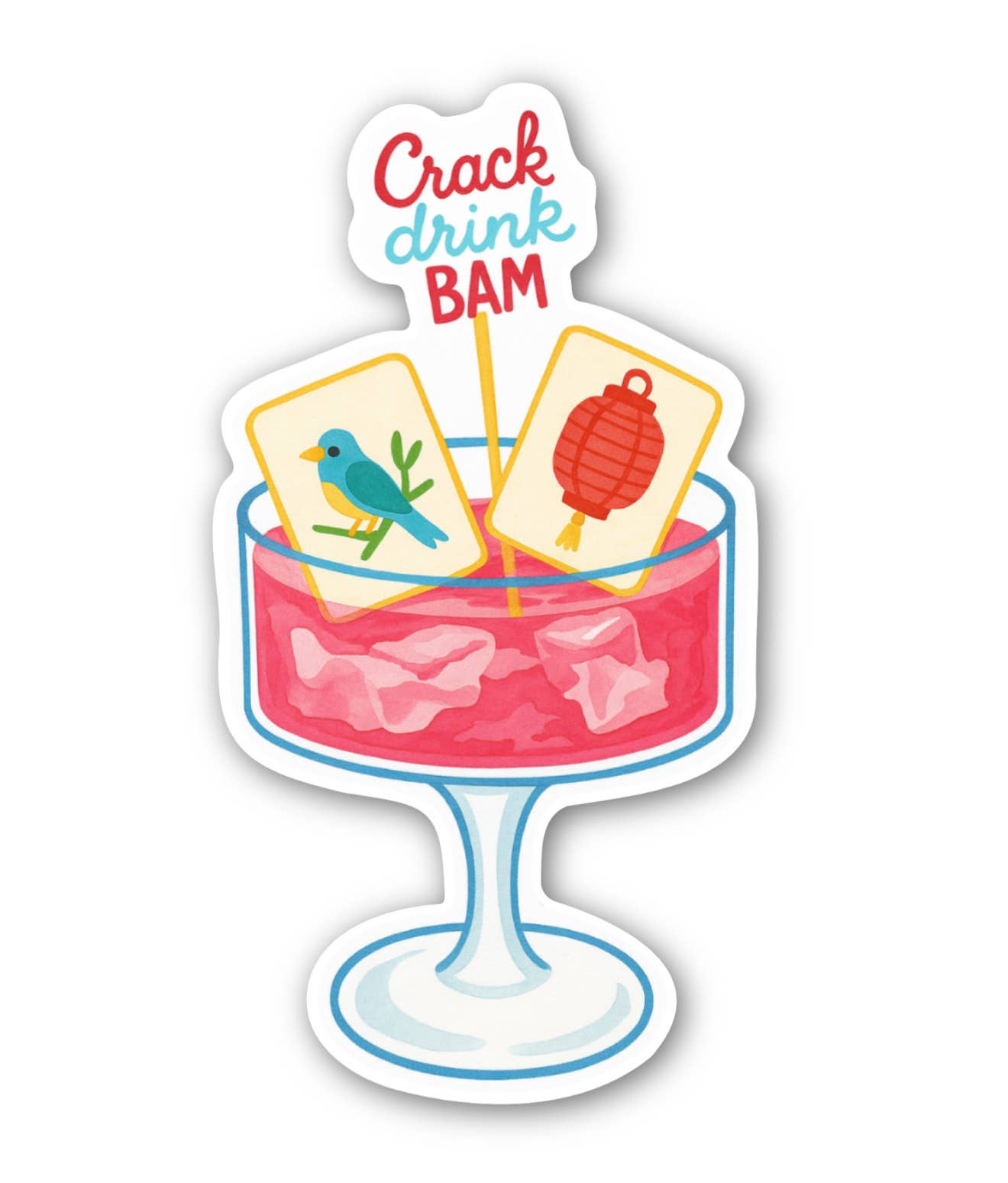 Bring a little Mahjong magic (and humor!) to your favorite surfaces with this “Crack • Drink • Bam” cocktail sticker. Featuring a playful glass filled with ice and two colorful Mahjong tiles—Crack and Bam—this fun design is perfect for Mahjong players, game-night lovers, and anyone who appreciates a clever twist on a classic phrase.