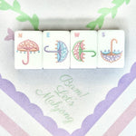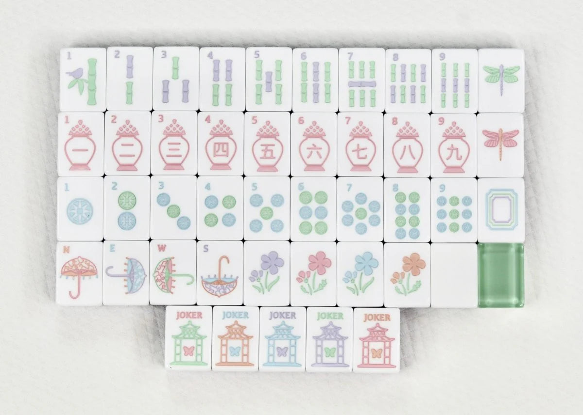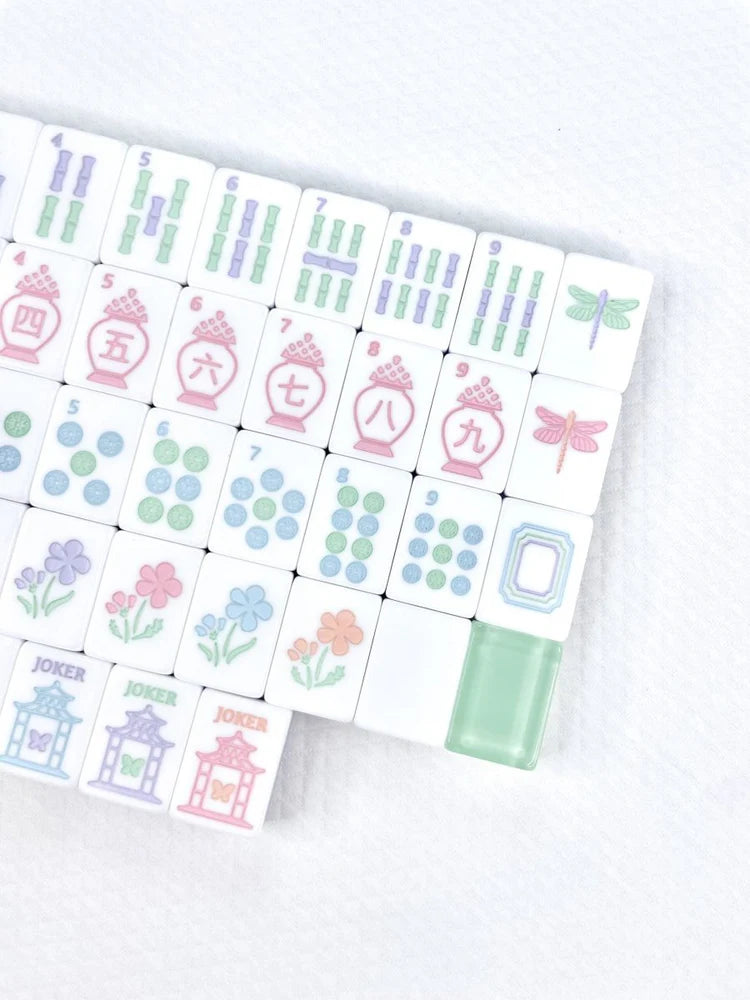 A unique Garden Party theme inspired by nature’s charm, blending beauty and tranquility into your games. This beautiful set showcases a colorful blend of pink, sea-glass green, violet, and light blue tiles, guaranteed to steal the spotlight at your next Mahjong gathering. The back of the tile is beautiful sea glass green.