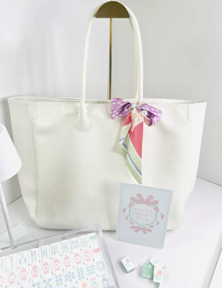 Introducing our elegant leather tote bag, meticulously designed for the fashionable and sophisticated woman. This spacious tote features a luxurious white interior lining and is perfect for carrying all your Mahjong essentials, including tiles, racks, a large zipper tile bag, mat, and more.