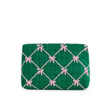 Measures L 8" x W 3.5" x H 6"Made from cotton and polyester, Sweet, sparkly, and ready to party — the Tinsel Bow Zip Pouch is your new favorite festive accessory. Featuring a textured body and an all-over pink sequin bow pattern, this pouch adds instant charm to your holiday look. With its roomy interior, inner slip pockets, and secure zip closure, it's perfect for stashing your essentials in style. Available in multiple colors, it’s a must-have for gifting or treating yourself.