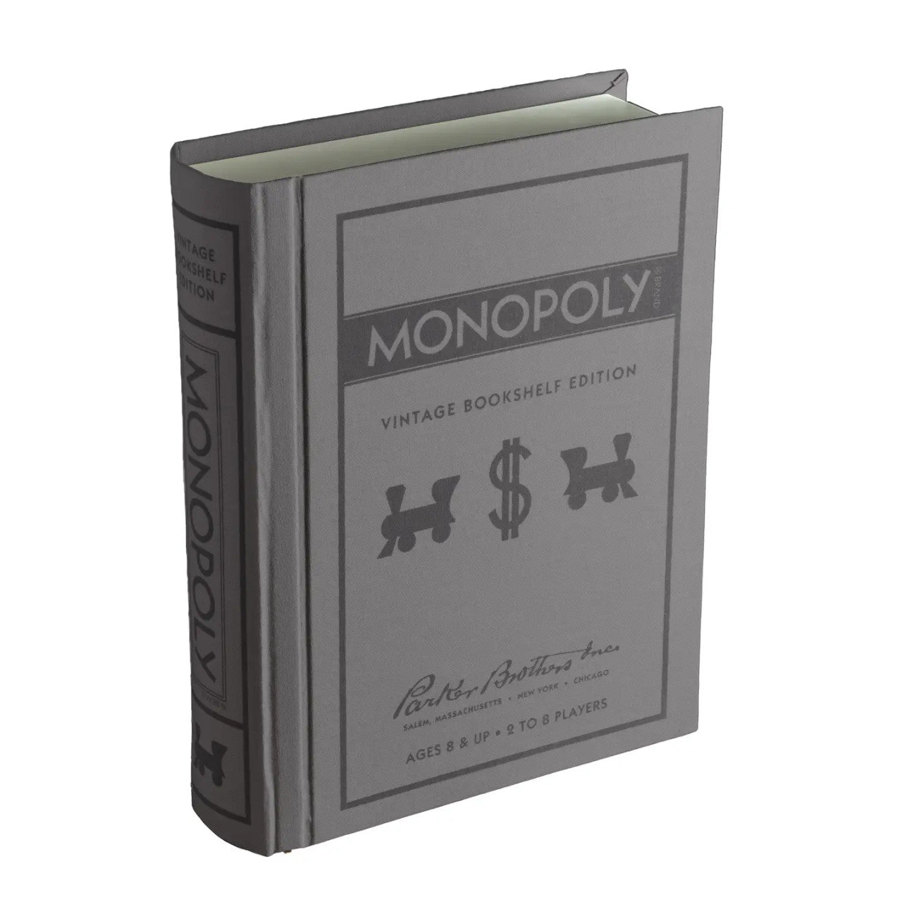 This Vintage Bookshelf Edition of MONOPOLY was inspired by the vintage graphics of the 1935 game. The game designers have created an elegant storage method that allows you to store this game and all its components on your bookshelf among the classics. The addition of premium game components create a classic to be enjoyed for generations to come. The game box is a fabric-wrapped book with integrated storage. A themed slipcase covers and protects the game box. Inside you'll find a vintage game board with graphics inspired by the 1935 edition and the following accessories: 32 Green Wooden Houses, 12 Red Wooden Hotels, Vintage Chance, Community Chest, and Title Deed Cards, MONOPOLY Money, Removable Bankers tray, 2 Ivory-Colored Dice, and instructions. Eight classic pewter player pieces (tokens) are included: Battleship, Boot, Cannon, Horse and Rider, Iron, Race Car, Scottie Dog, Thimble, Top Hat. 10.625 x 8.375 x 2.63 inches.