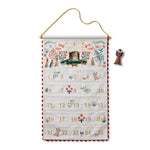 Count down to Christmas with our fabric advent calendar, featuring embroidered, nativity-inspired illustrations, metallic gold accents, and a stuffed figurine to move from day to day. The calendar hangs from a dowel with a rope cord for display.