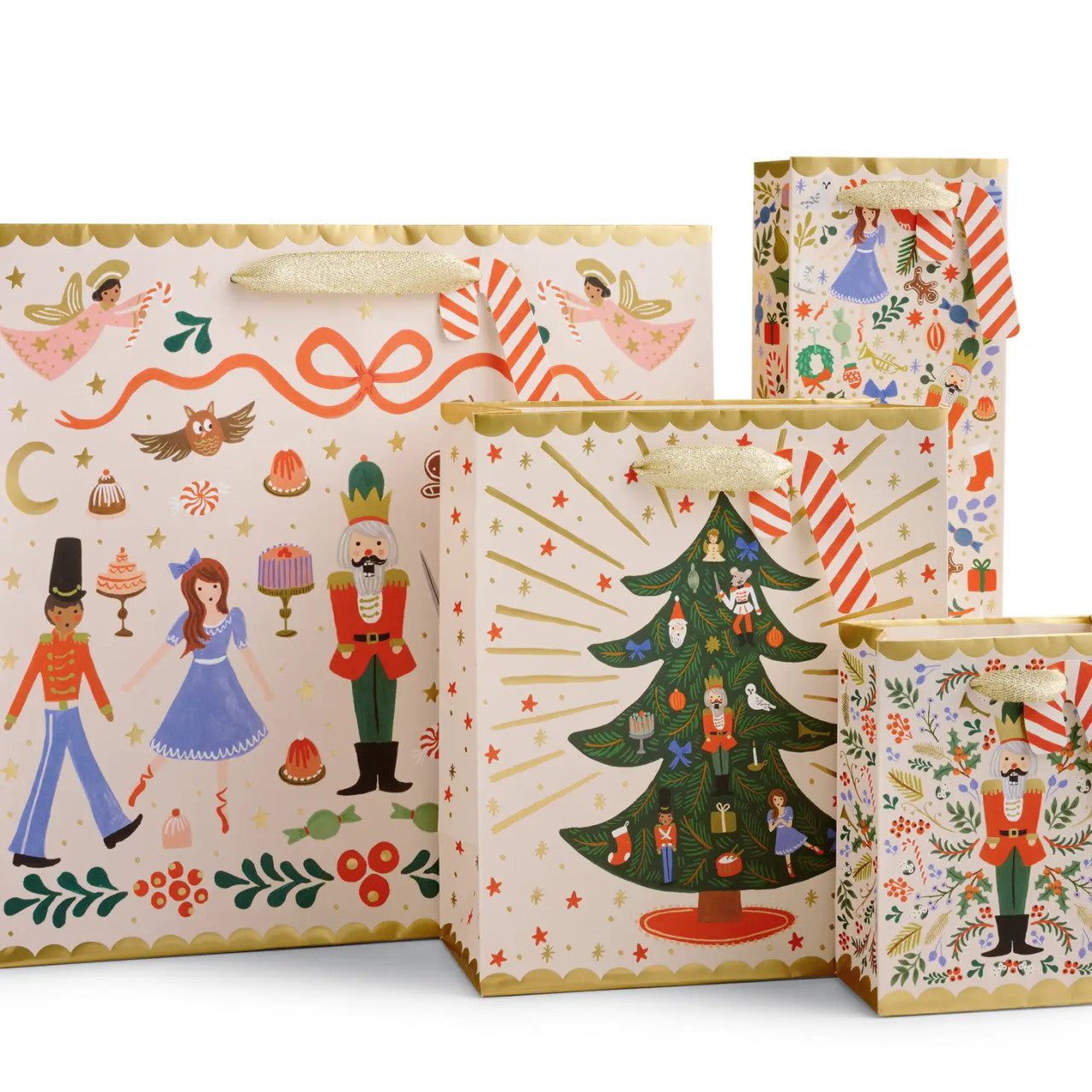 Giving gets even more special with our gift bags, which feature charming extras like gold foil accents, cotton ribbon handles, and a coordinating “To” and “From” tag. DETAILS - S: 6" L × 4.5" W - M: 9.5" L × 8" W - L: 12.5" L × 13" W - W: 13.75" L × 4" W - Uncoated paper with cotton ribbon - Printed in full color and foil stamped - Metallic gold foil - Metallic cotton ribbon handles - Cardboard floor insert - Coordinating "To" and "From" tag