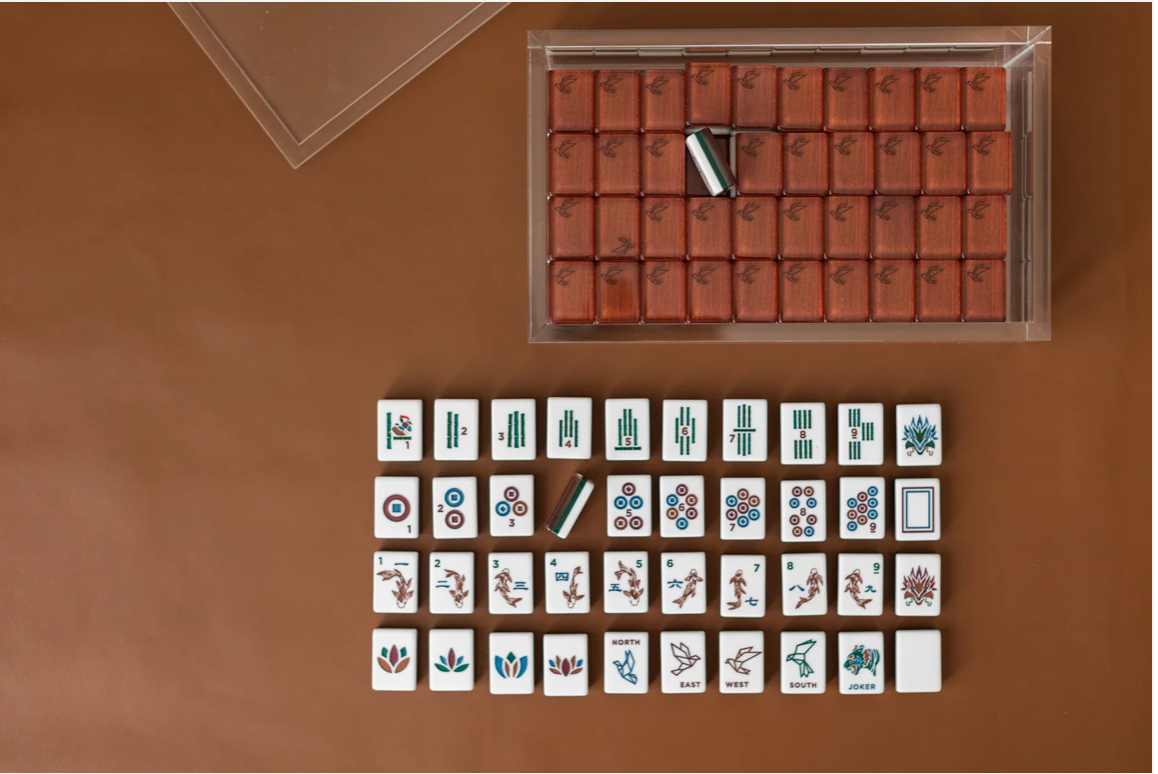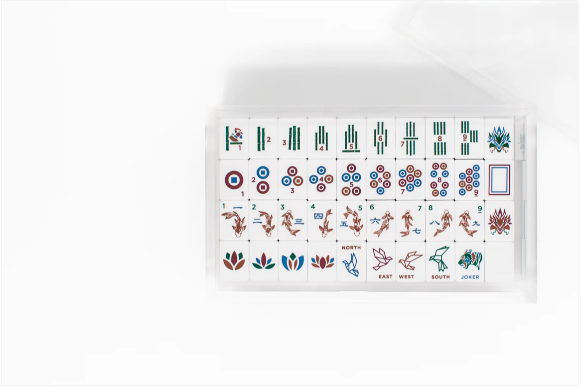 The tile set comes with a custom sized lucite display box that is just the right size for this beautiful set. Each tile set comes with two dice and a tile guide that shows all of the tile designs on one side and some things to remember about the game of mahjong on the other side, just in case you need a quick refresh.
