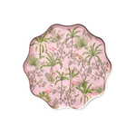 Our Palm Beach Dessert Plates feature a lush jungle scene with flamingos, cockatoos, and playful monkeys set against a soft pink backdrop. The scalloped edges and metallic gold trim add a luxe finishing touch that’s both elevated and fun.
