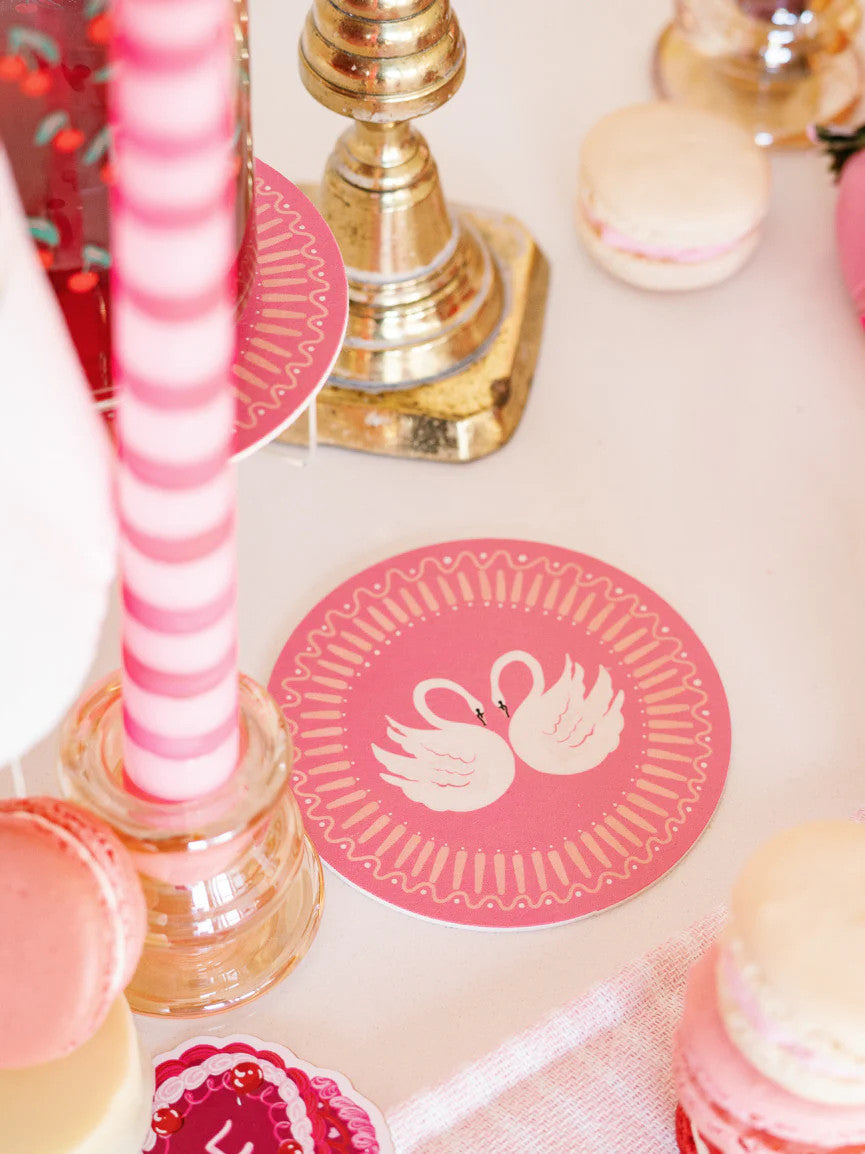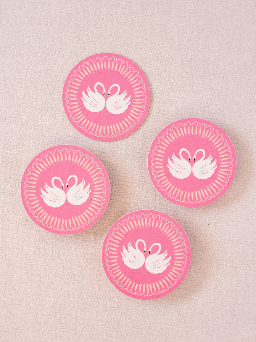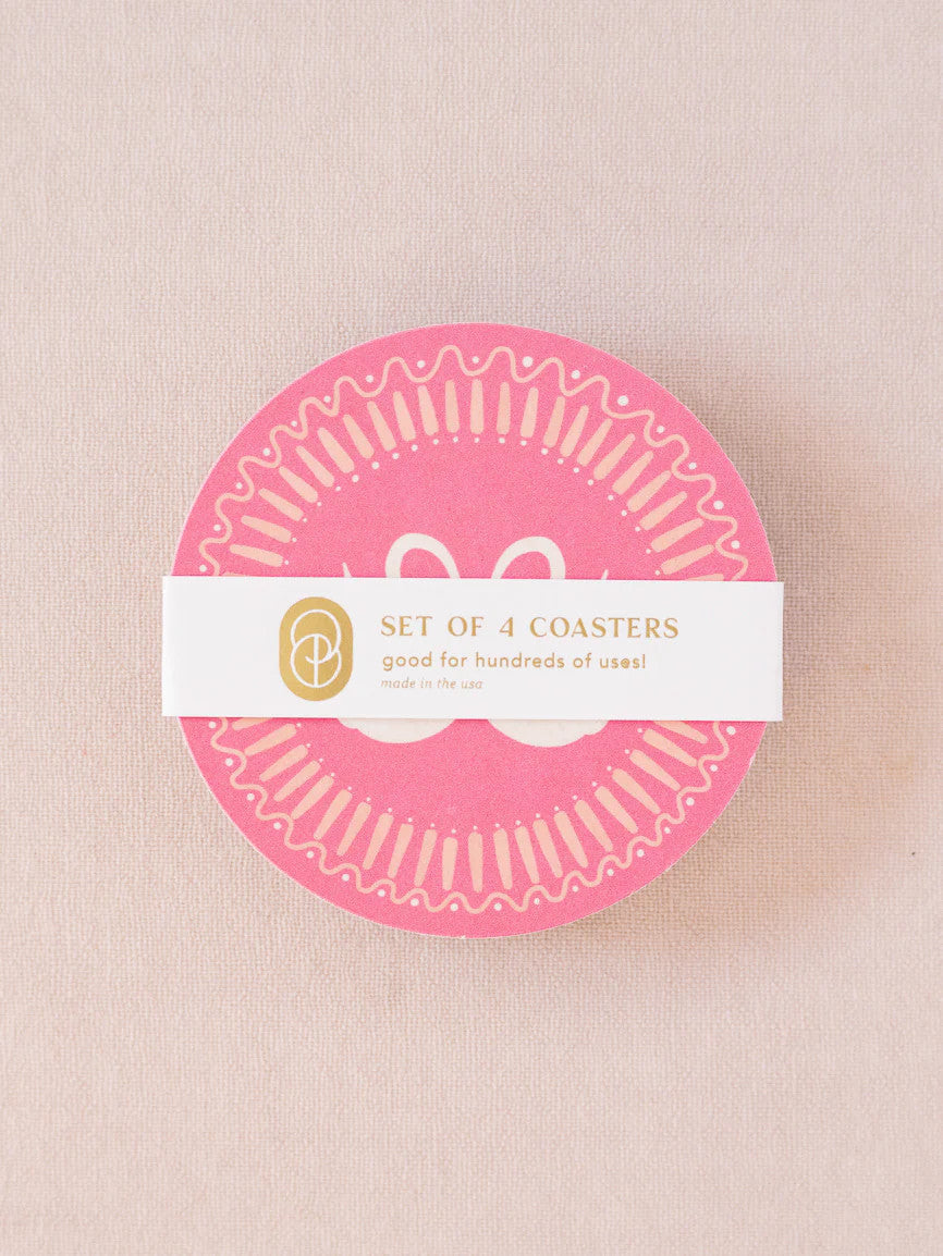 Our coasters are comprised of wood pulp, made exclusively with shavings from sustainable forestry. They are printed with UV ink, and packaged with a foil-pressed belly band made of recycled cotton paper.