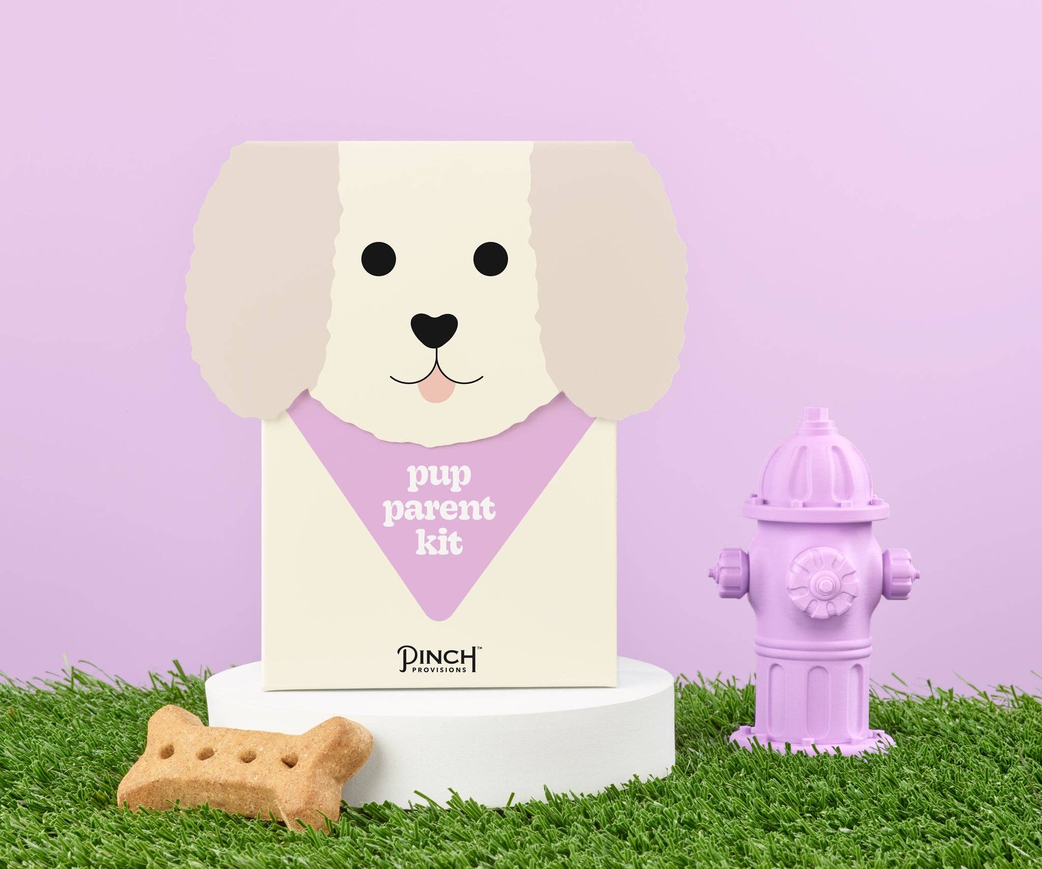 It's our most paw-some dog product yet! Introducing the Pup Parent Kit by Pinch Provisions...because dog moms and dads are parents, too! Each kit contains a fun assortment of items that a new or veteran pup parent might need, including a selfie treat clip, belly scratching tool, pet hair remover, mini treat bag, used waste bag holder, and 10 doggie business cards. The darling tent box with diecut pup will guarantee tail-wagging impact at shelf. Also available in spot and bulldog styles. Buy the whole dog pack!