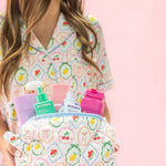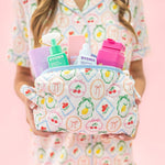 This quilted cosmetic pouch in our signature Fruit Cocktail pattern is made for beauty essentials, travel minis, or your everyday must-haves. The wipeable gingham interior makes cleanups a breeze, while the side handle adds grab-and-go convenience. Soft, structured, and oh-so-sweet — it’s the pouch you’ll reach for again and again.