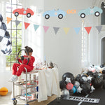 - Two pre-threaded garlands - one with race cars and one with 14 triangle flag pennants