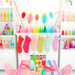 Rainbow Stripe Paper table cloth or wrapping paper roll. Measures 2' by 6'. Use to wrap gifts or as a disposable table cover.