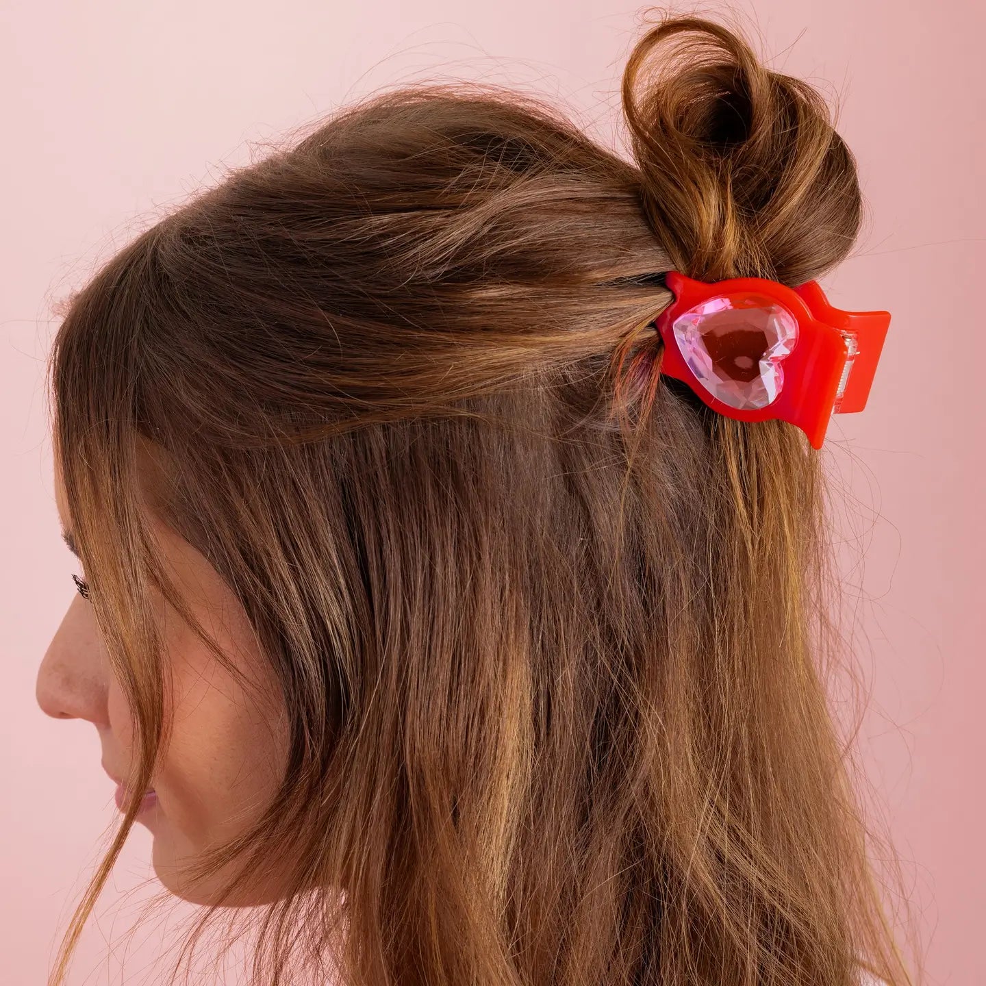Elevate your store with our top-selling claw clips! Perfect for everyday wear, these fun hair accessories come in a range of sizes, colors, and designs to suit every style. Details * Size: 1.96" tall x 1.77" wide * Red clip * Pink heart gemstone on each side of clip * Imported