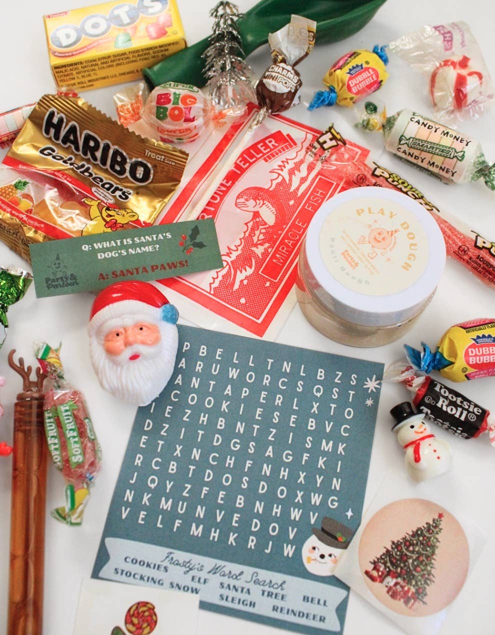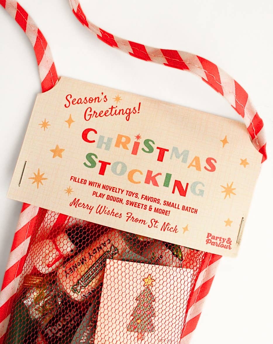 Remember those red mesh Christmas Stockings from yesteryear? Us too! That's why we put our spin on this nostalgic classic with all sorts of fun goodies pre-filled inside for your modern day holiday celebration! This playful stocking comes filled with an assortment of sweets, favor, toys, stickers, a temporary tattoo, a silly joke, bubbles and our small batch play dough.