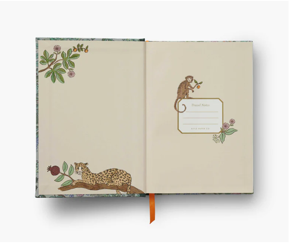 A guided hardcover journal wrapped in bookcloth featuring an illustrated print inspired by old world travel. Inside find sections for dream travel destinations, sights to see, activities to do, places to eat, hotels to visit, and travel log pages, plus a grosgrain ribbon bookmark