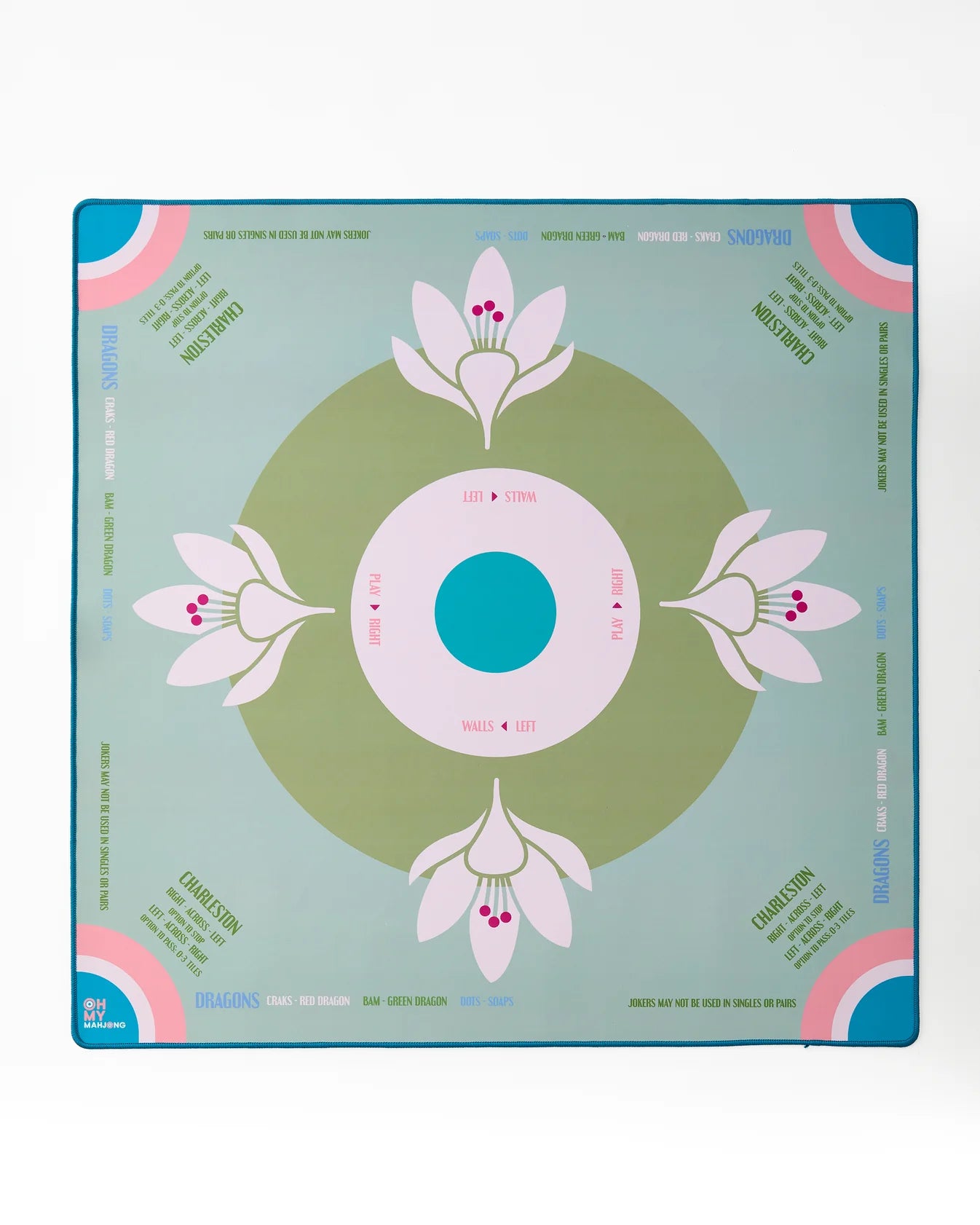 Feast your eyes on the Sage Lotus Mahjong Mat –– a mesmerizing collection of sage greens, delicate pinks, and serene blues that guide you into tranquility and elegance. This mat is more than just a beautiful backdrop for your games –– it's a mix of style and practicality. With its soothing colors and intricate design, prepare to be transported to a tranquil garden oasis that sets the stage for hours of immersive gameplay. The helpful addition of essential rules for American Mahjong are placed along the sides. Let's not forget its practical side –– with a non-slip surface that ensures stability and precision.