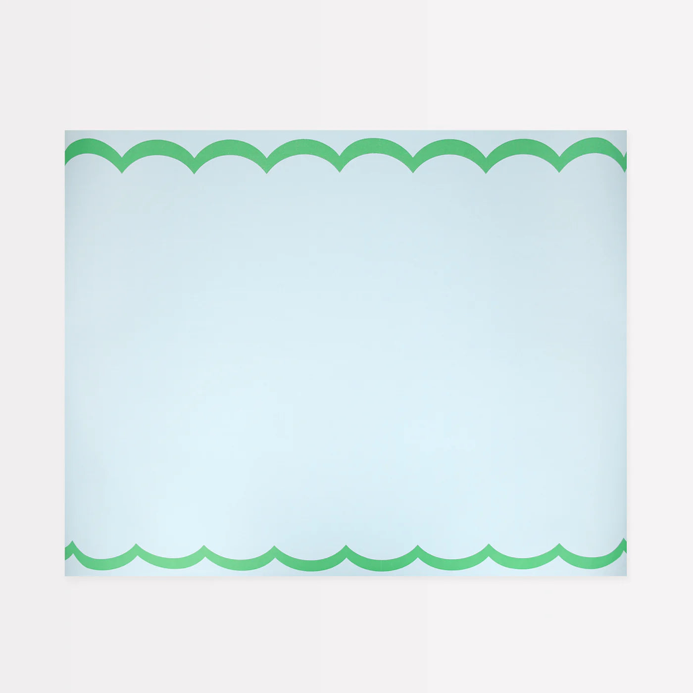 - The pattern, of a white scalloped design, is repeated throughout the whole of the runner
