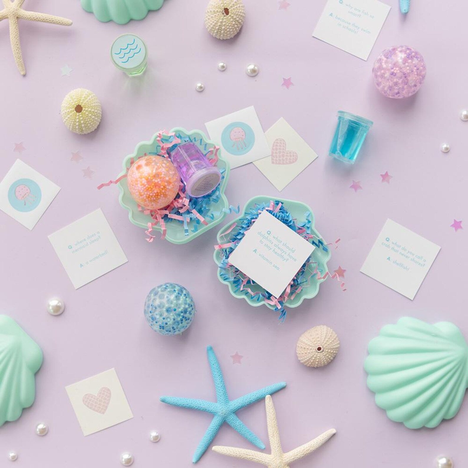 Get ready to shell-ebrate in style with our Shell Favor Kit! Each sea shell party favor includes a joke, a sticker, a temporary tattoo, slime and a sensory ball. Perfect for any mermaid lover, this kit includes everything you need to create fin-tastic party favors.