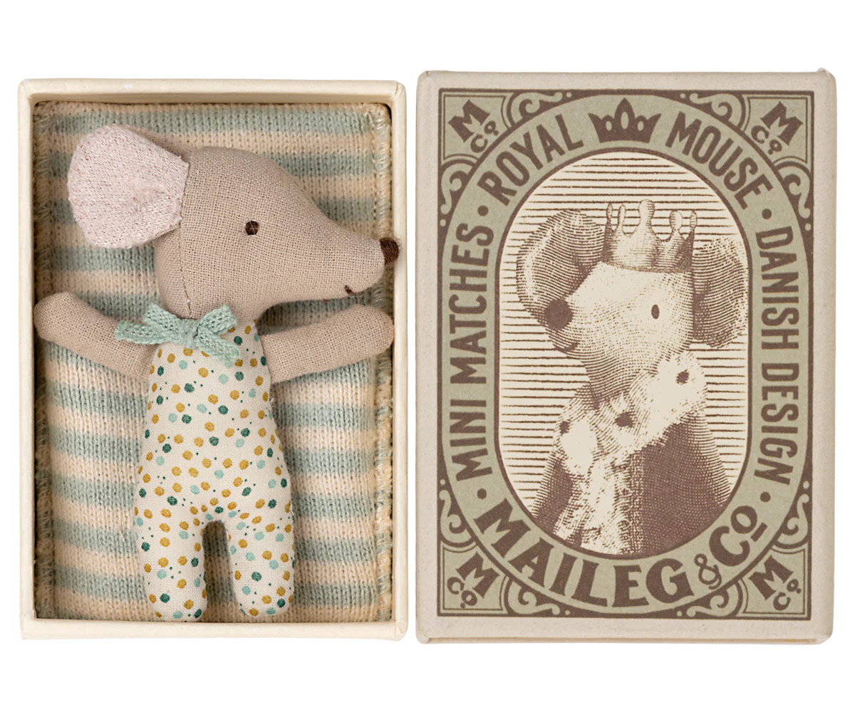 A classic Maileg item. This mouse is ready for hours of play and sleeps tight in the little matchbox. The clothes and bedlinen are made of soft fabrics with unique prints in beautiful colors.