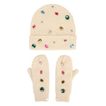 Cozy meets glam with this gem-covered beanie and mittens! Adorned with colorful, jewel-like stones, it adds the perfect pop of sparkle to any winter look. Crafted from soft, high-quality knit for all-day warmth and comfort, this beanie is as functional as it is fabulous.