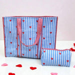 Fall in love with our Sweet on You bag set — a charming duo that’s as cute as it is practical! This blue-and-white striped tote and matching makeup bag are sprinkled with tiny red hearts and finished with playful red stitching for a pop of personality. The roomy tote is perfect for everyday errands, beach days, or weekend getaways, while the coordinating makeup bag keeps your essentials perfectly organized.