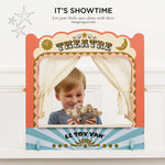 This theatre brings timeless charm to any playroom or living space. Drawing back its show curtains, watch the magic come alive! Complete with a ticket window booth, chalkboard showtime board and sophisticated gold paint details, this is a toy for all.
