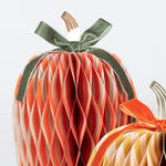 Add a cosy yet stylish touch to your fall and Thanksgiving decor with these striped honeycomb paper pumpkins. Their rustic colors, textured 3D design, and soft velvet bows bring charm and sophistication, while bold stripes and gold foil details create an eye-catching look. Sturdy, yet easy to set up, the three sizes can be grouped together or separately, ideal for your table, mantel, in your porch. When not on display, simply fold them flat for storage and reuse year after year