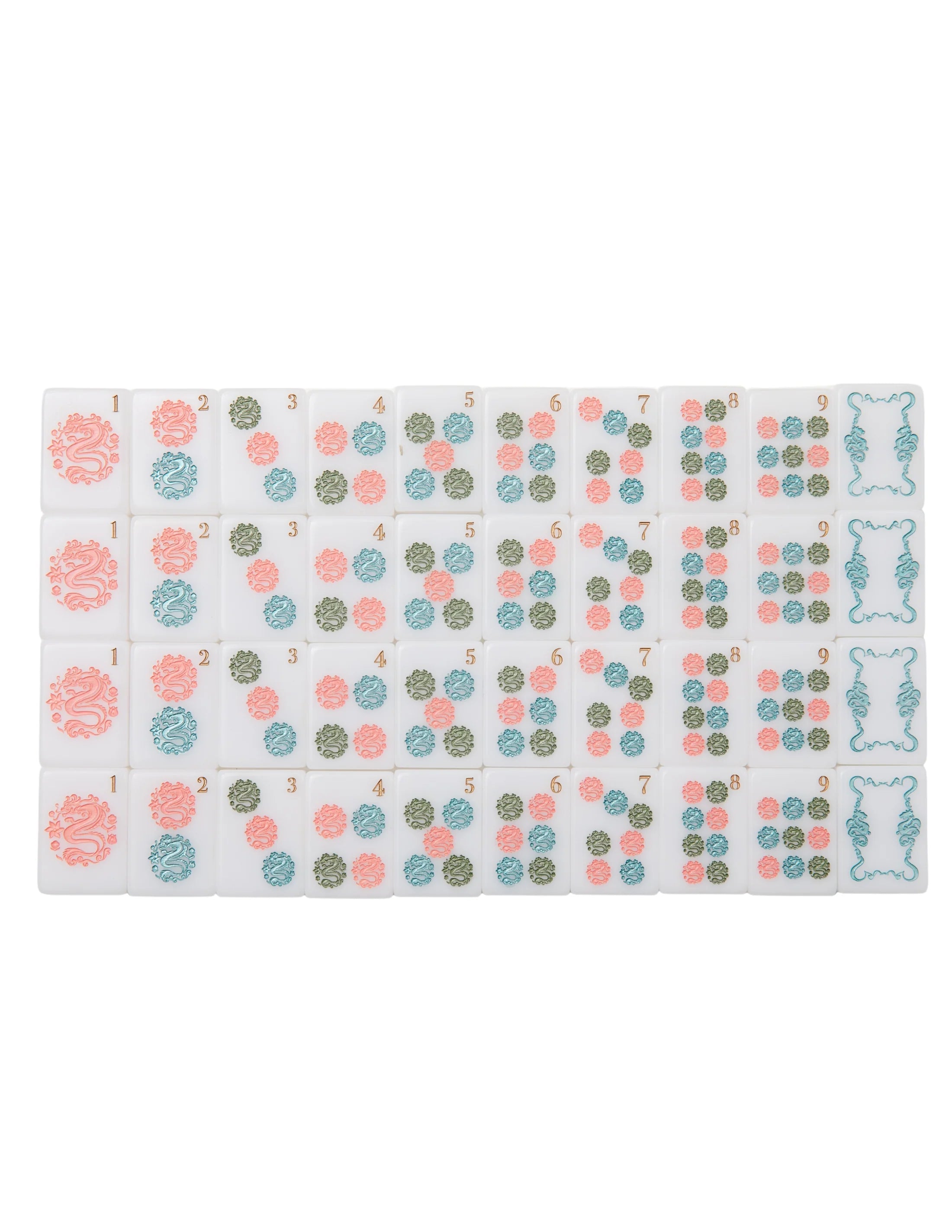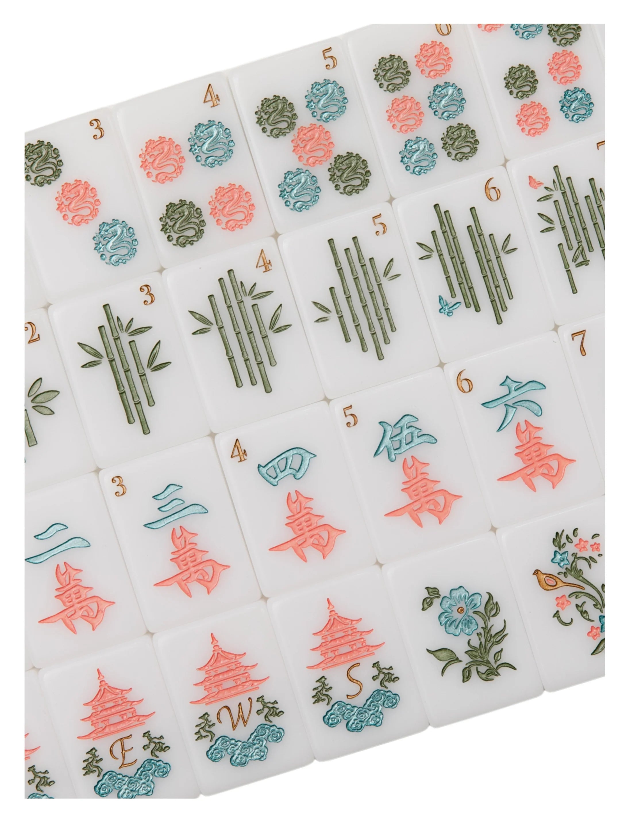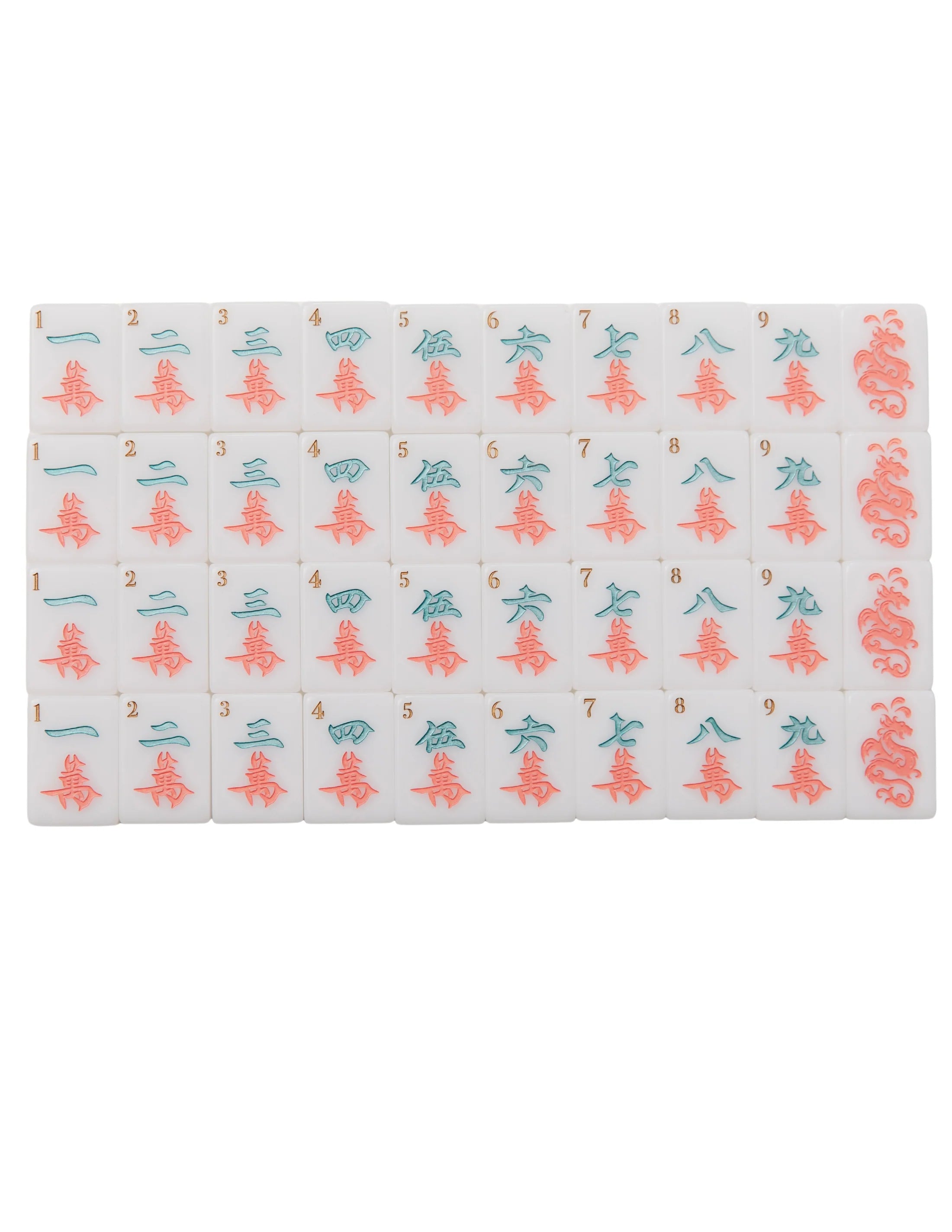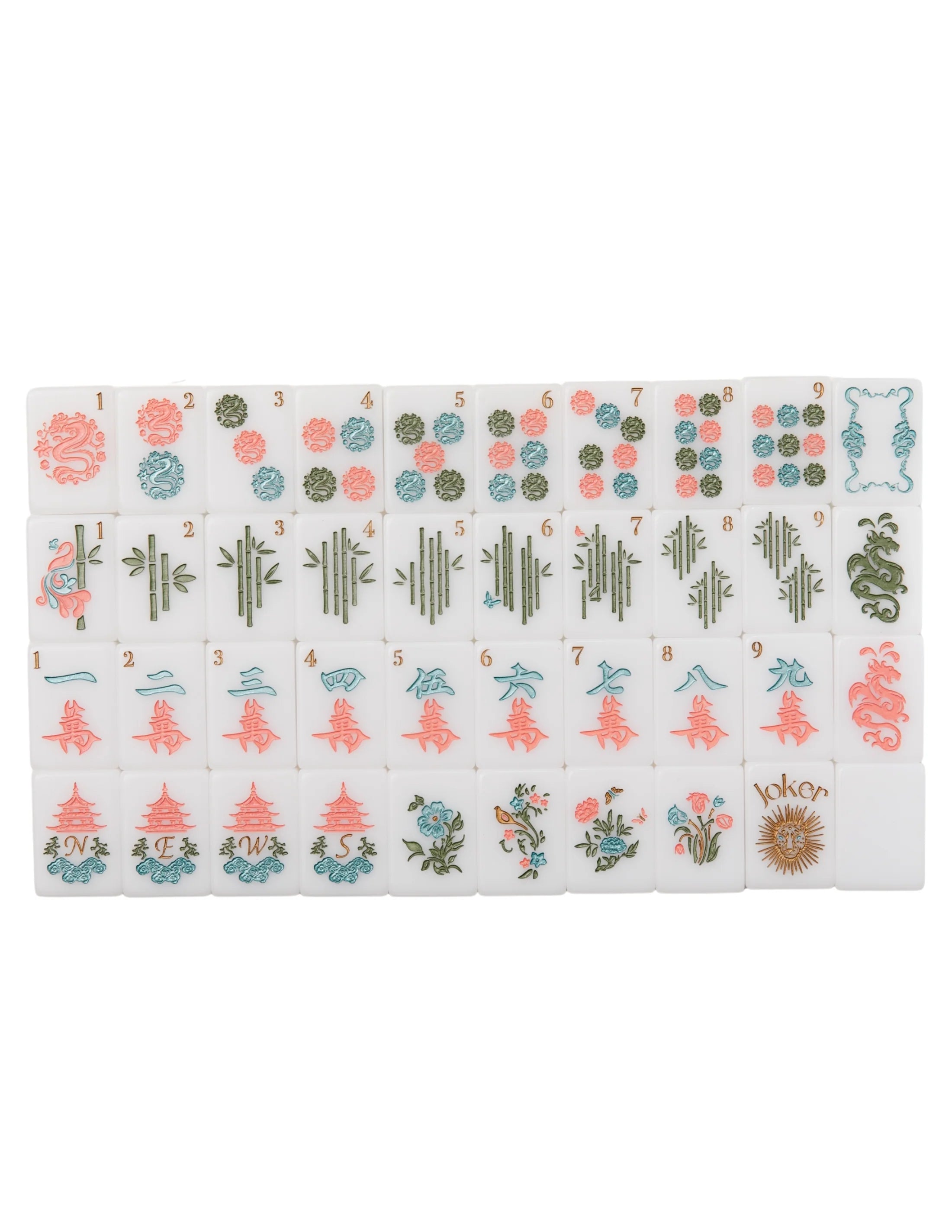The Classic Set showcases Club Mah Jenn's iconic symbols, representing the timeless beauty of the Far East. Delicately engraved onto clean white acrylic tiles and meticulously hand-painted with the luxurious metallic colors coral, jade, aquamarine, and gold.