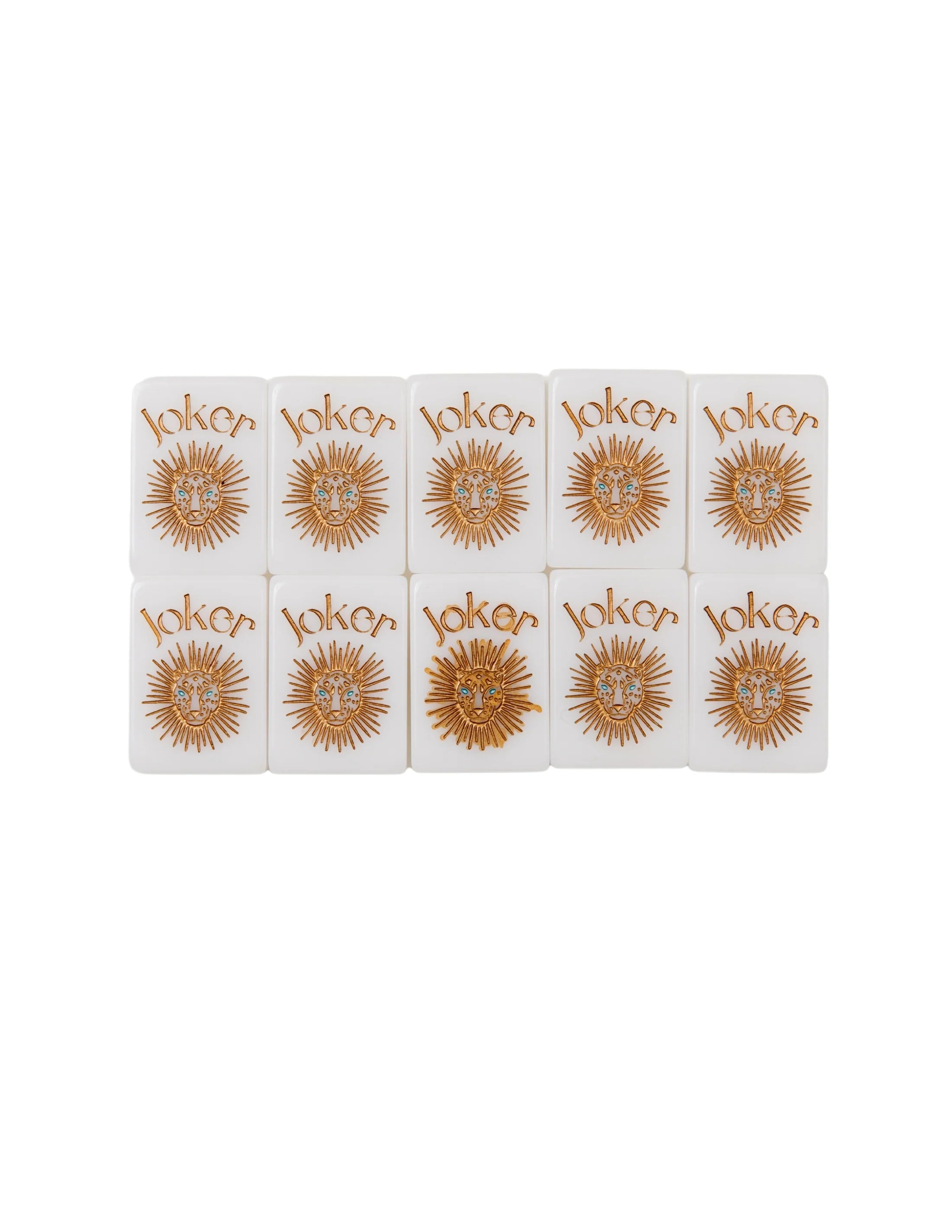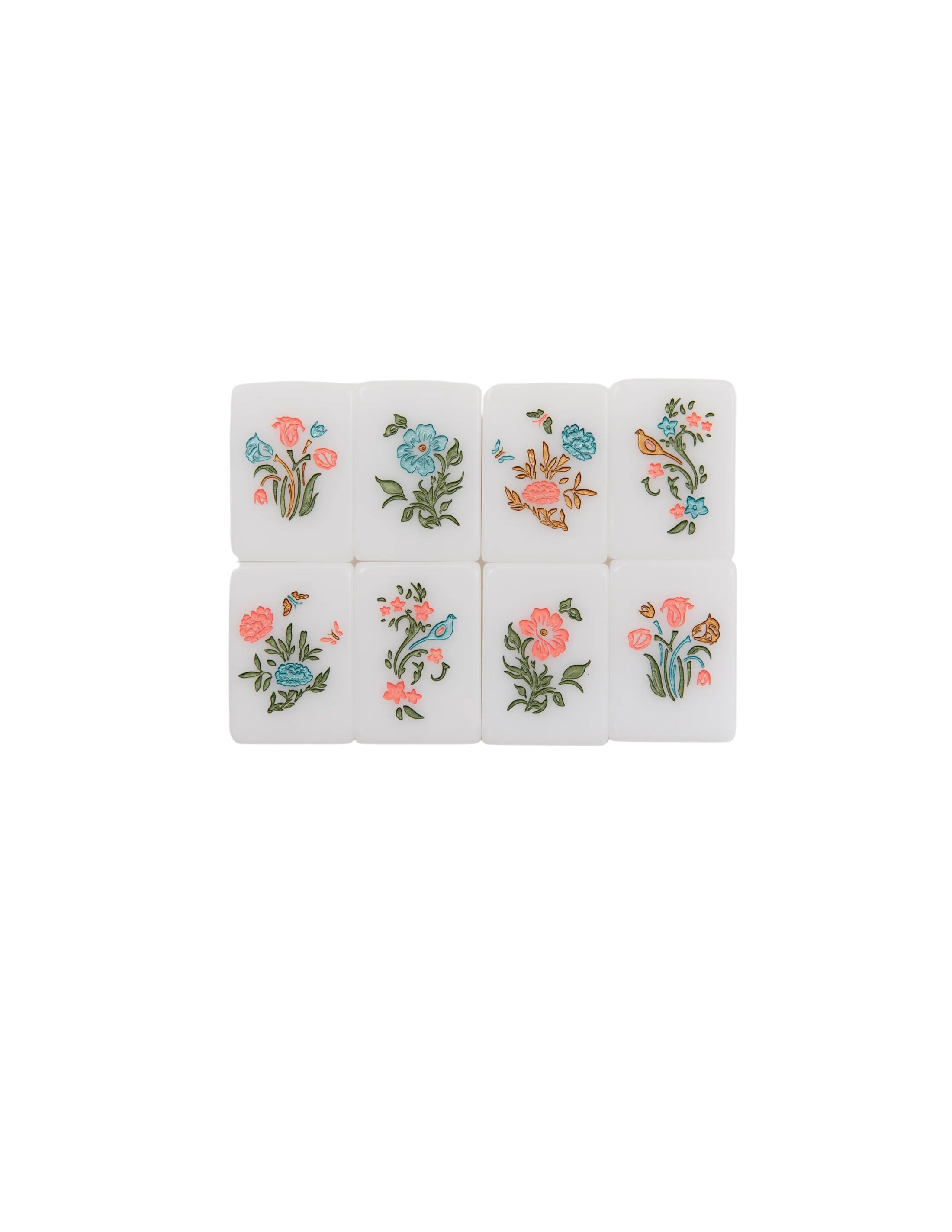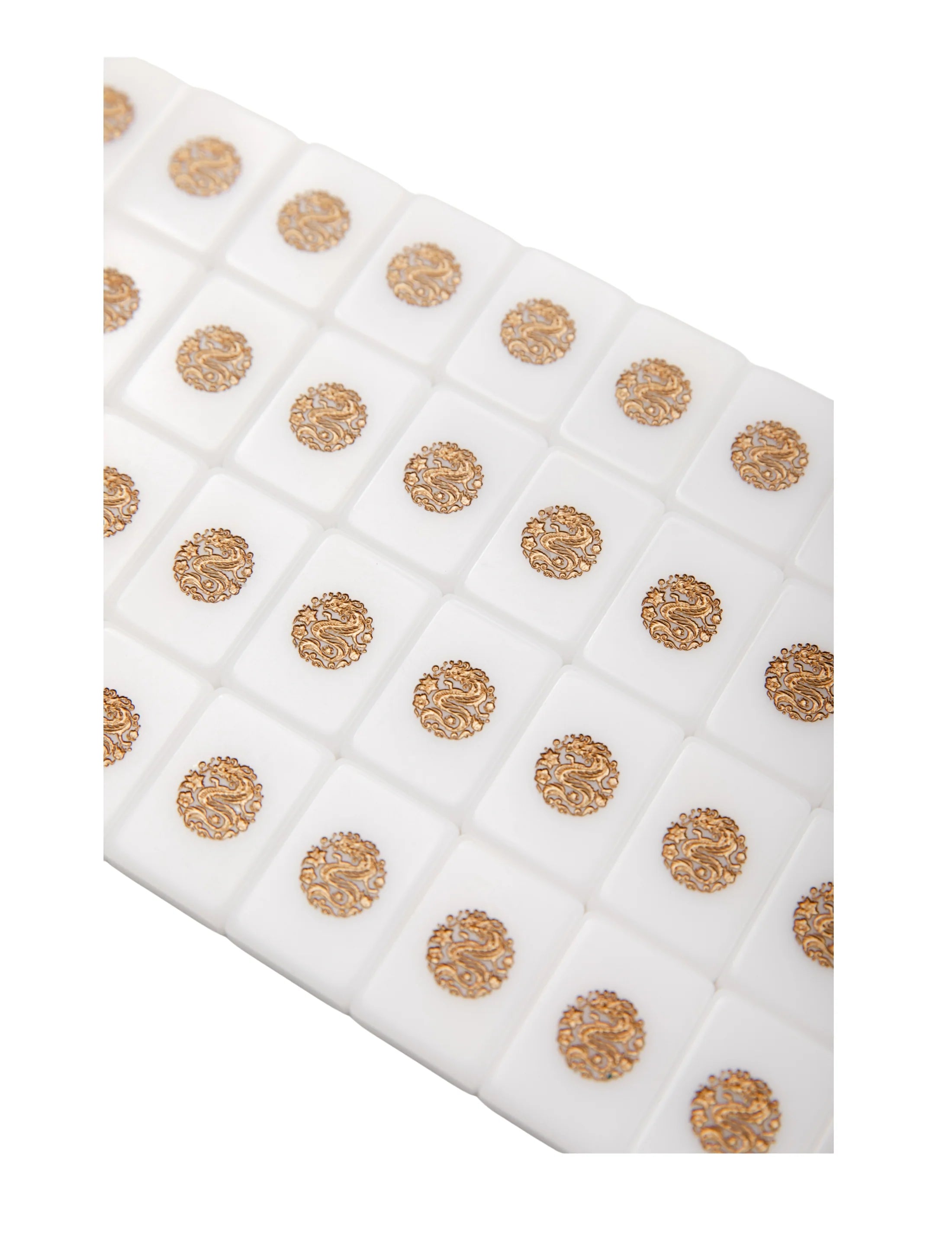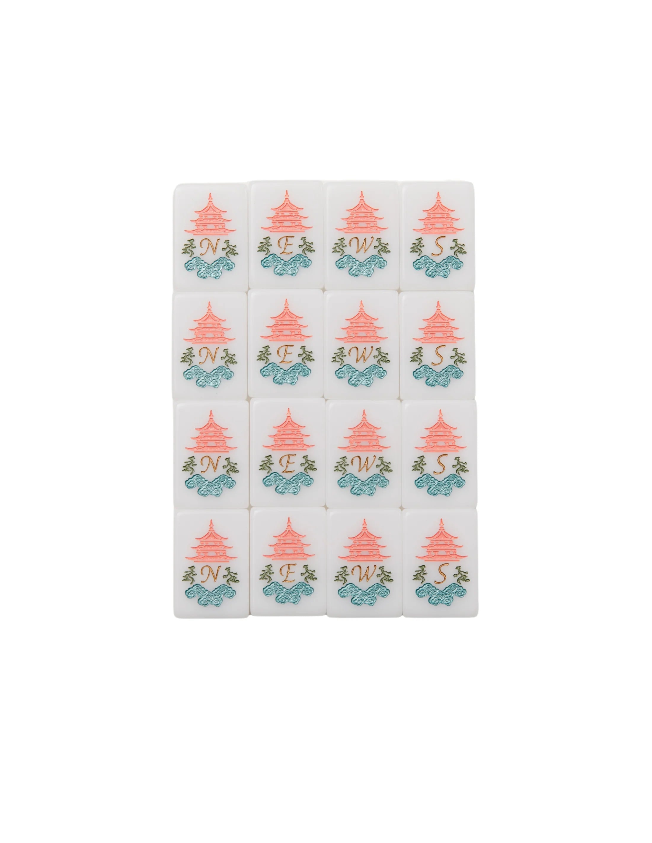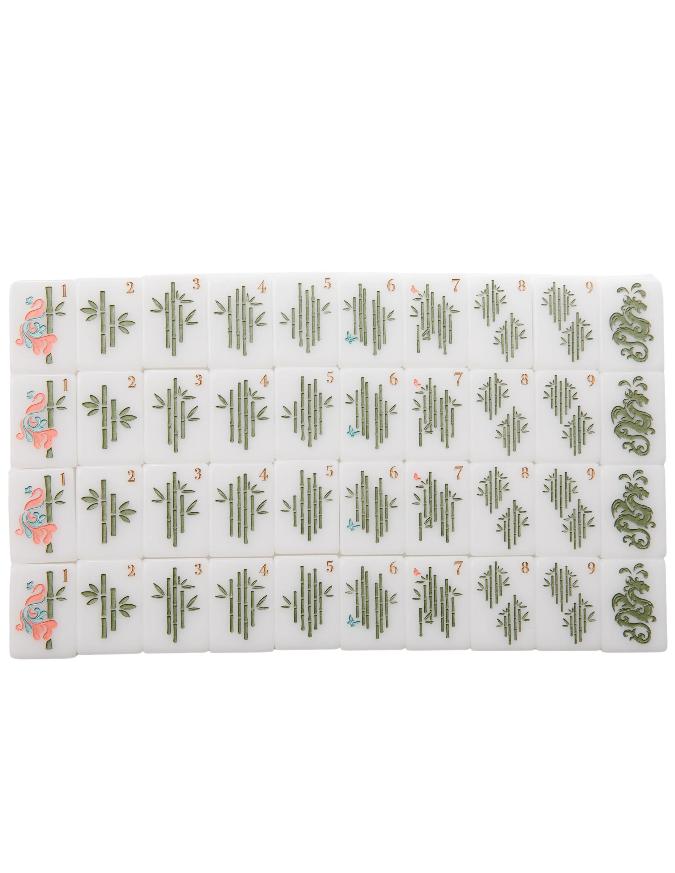 The Classic Set showcases Club Mah Jenn's iconic symbols, representing the timeless beauty of the Far East. Delicately engraved onto clean white acrylic tiles and meticulously hand-painted with the luxurious metallic colors coral, jade, aquamarine, and gold.