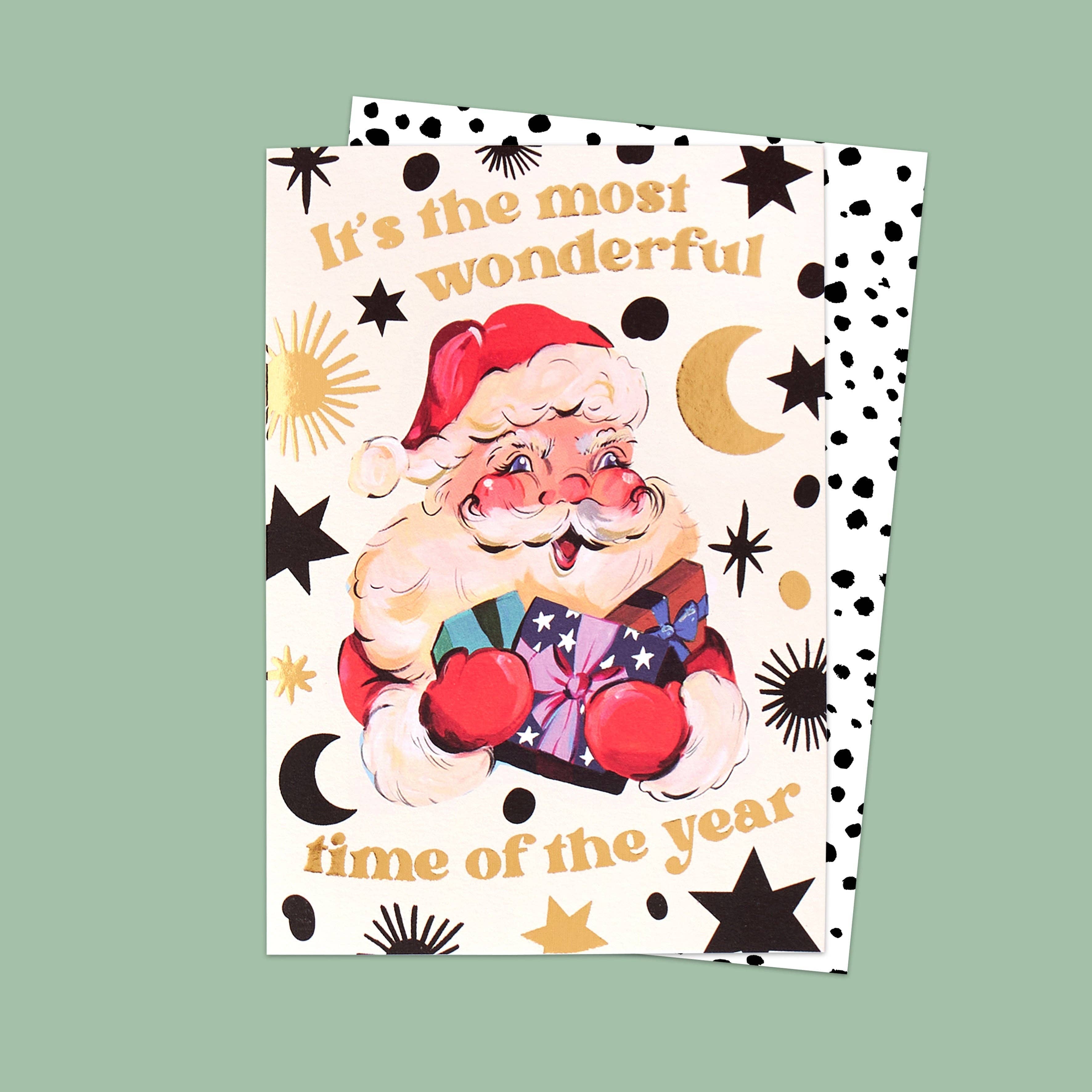 Spread cheer this Christmas season with this festive card! Featuring a starry pattern with gold foil detail and a cheerful Santa illustration, The Most Wonderful Time Of The Year Card is the perfect way to wish someone a Merry Christmas.