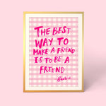 Create your own Barbie dream house with our new prints! This print features a Barbie quote that reads "The Best Way To Make A Friend Is To Be A Friend" over a pink gingham background. This quote is a wonderful way to gift your friend something special, especially if they love Barbie and pink.