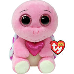 Torte is a pink turtle Beanie Boo with a cream coloured belly and feet. She has glittery pink button eyes, pink thread nostrils and black stitched eyebrows. She has a white shell on her back covered in pink patches and holds a shiny pink heart in her hands.