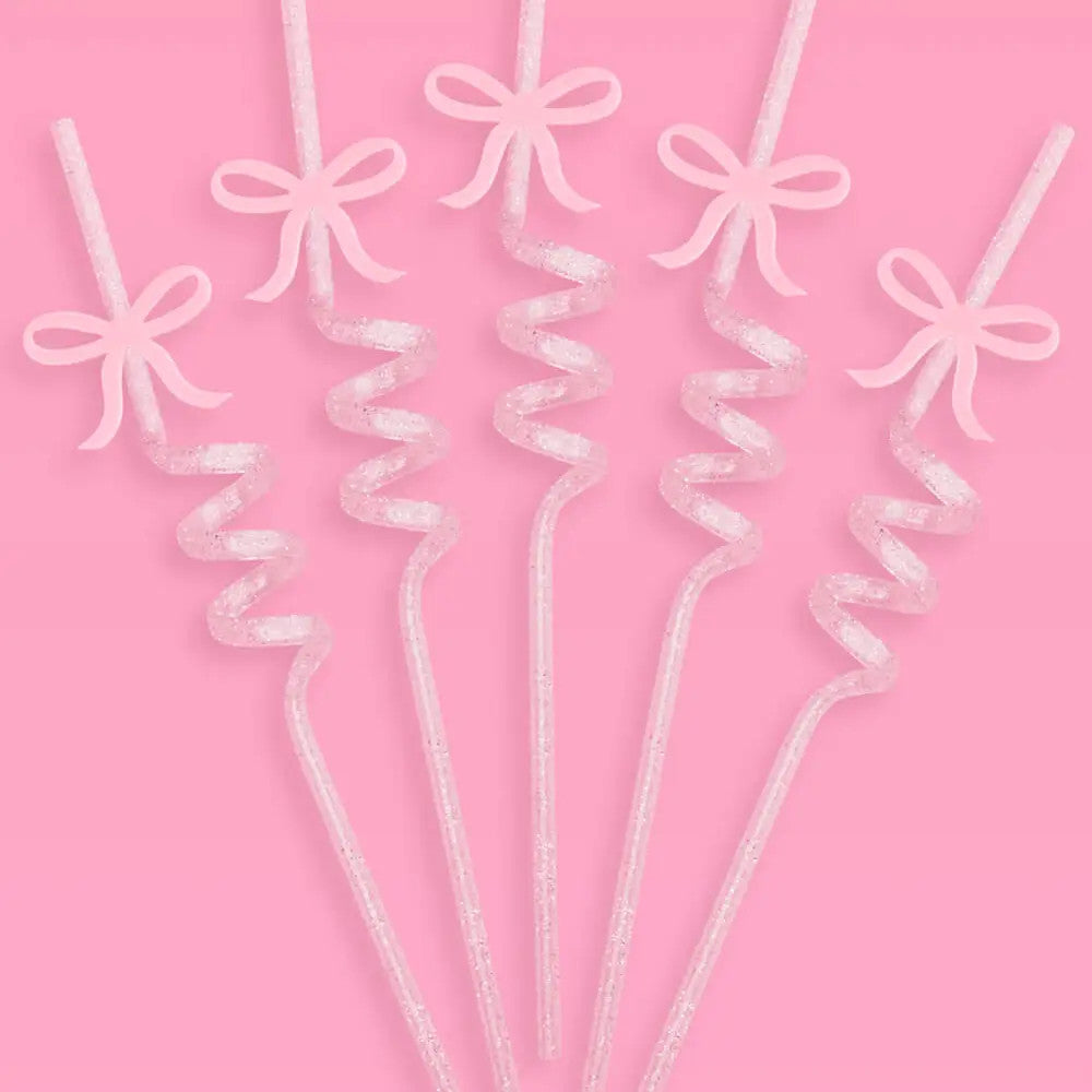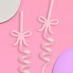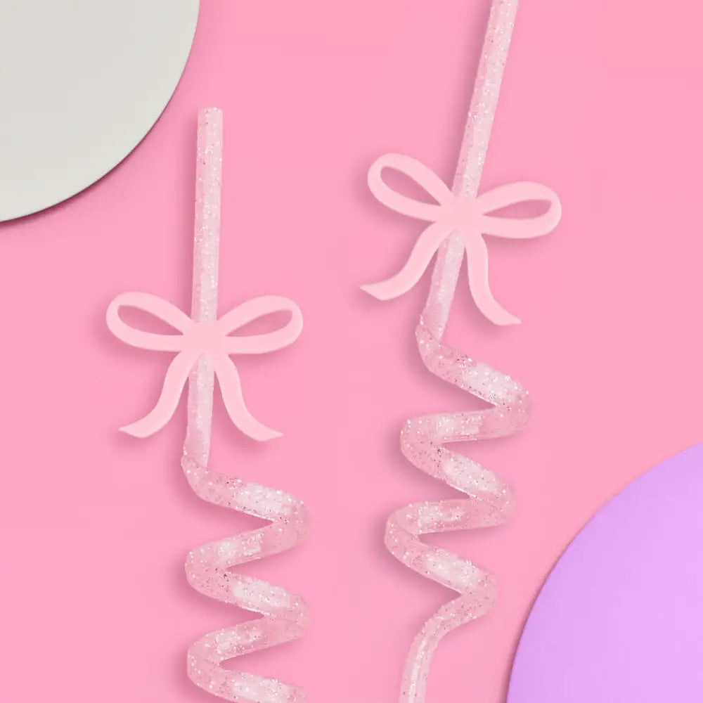 Pretty and pink ? || Made for the babes who love everything pretty and pink. Whether its a bday, bridal shower, or bach, celebrate in bow bliss with our super cute party straws. 16 reusable silver glitter twirly straws Straws measure 10" Removable acrylic bow charm