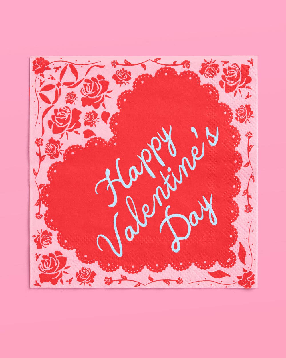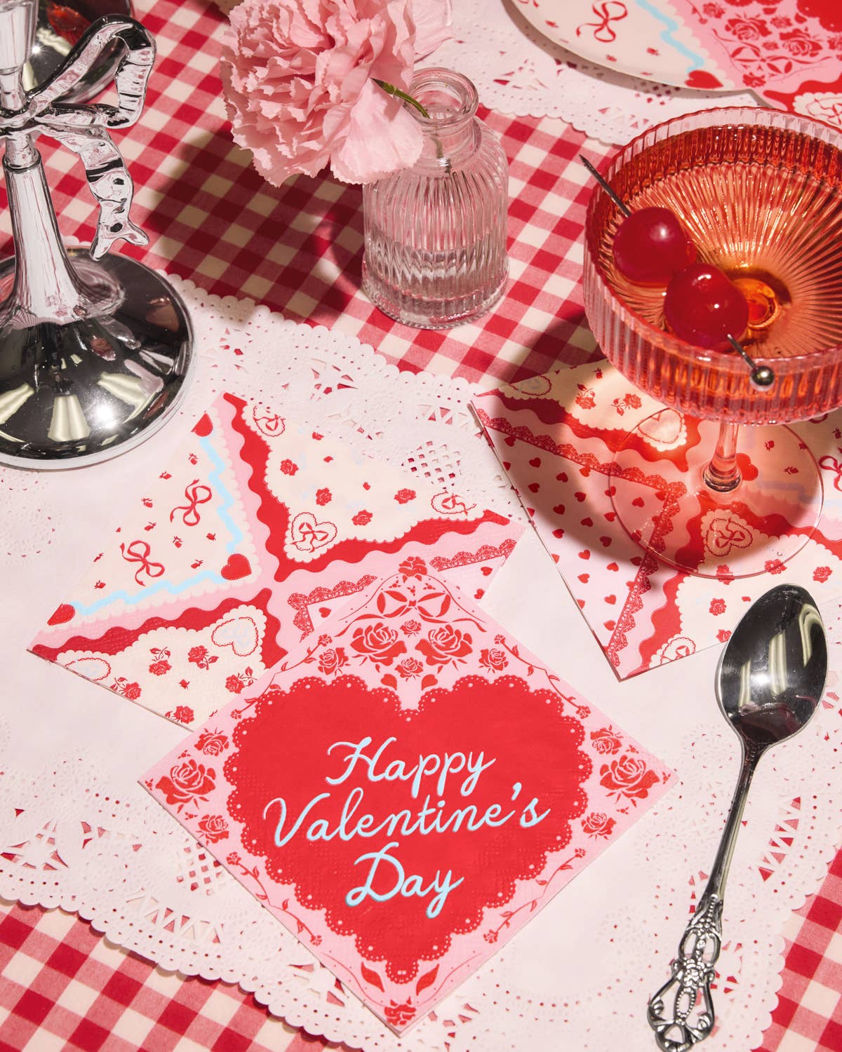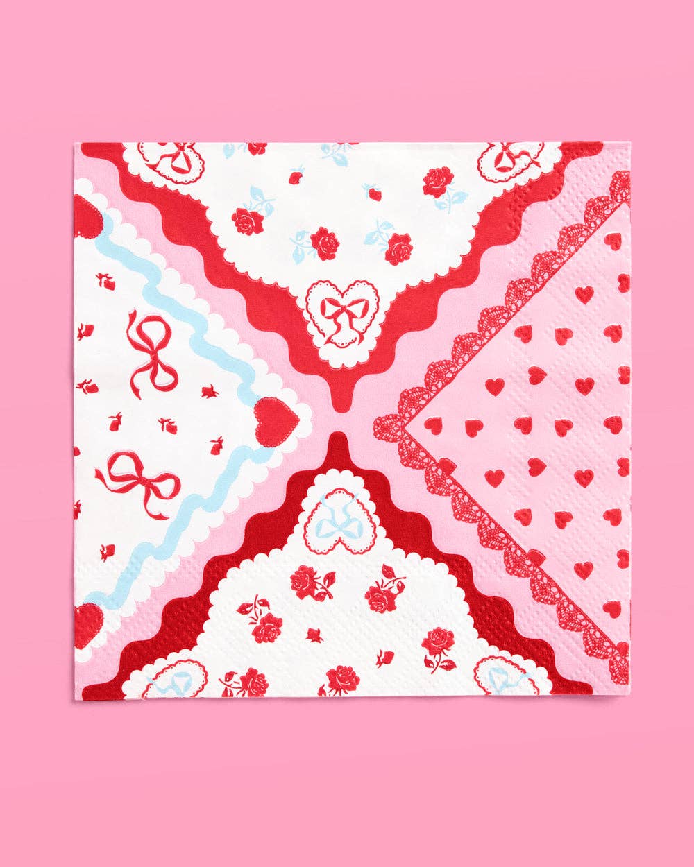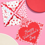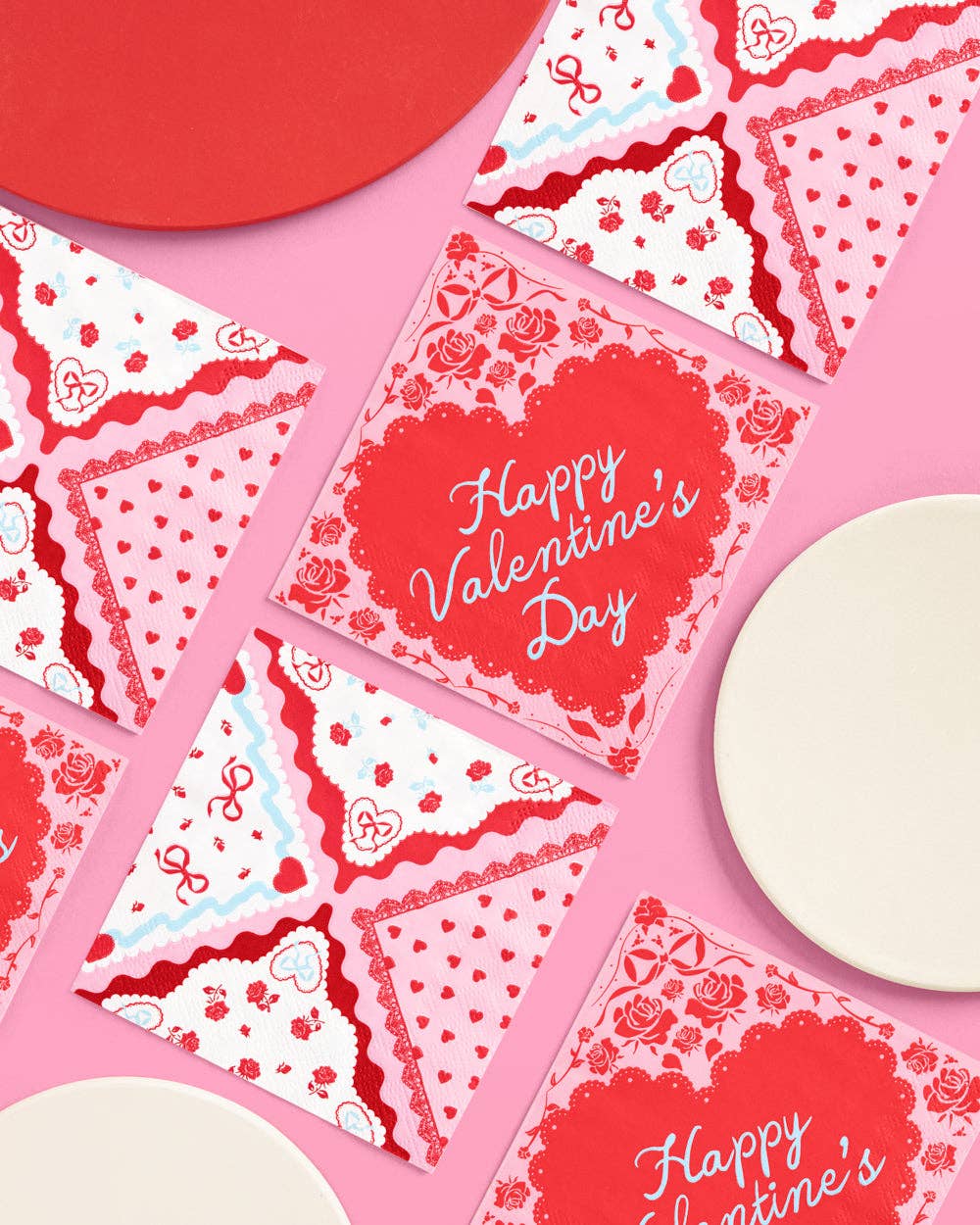 Wholesale buyers love fast styling power, and these Valentine cocktail napkins deliver: pink and red palette, two coordinated prints, and a compact 5 inch size that photogra
