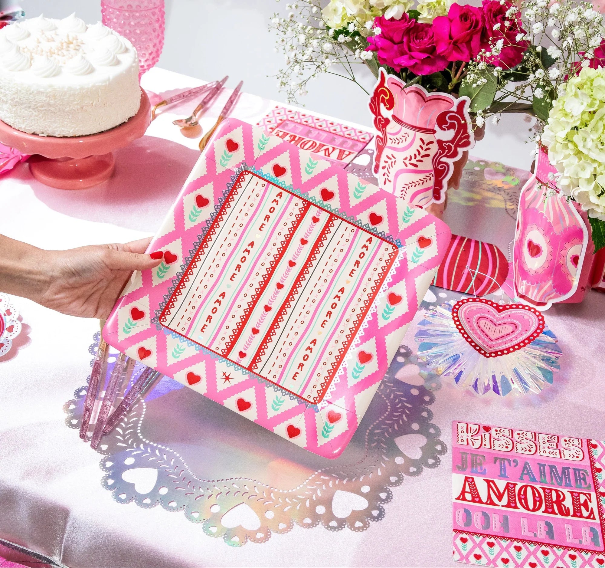 Set the table for love with our Valentine's Day Dinner Plates! These 10" paper plates feature a festive mix of pink, red and mint green details in a playful heart pattern and shimmering silver iridescent foil accents that catch the light beautifully. Complete with XO's and "Amore" for that extra dose of L-O-V-E, these plates are perfect for Valentine’s dinners, Galentine’s brunches, or any celebration where love (and style) is on the menu. Durable, festive, and photo-ready - because every meal deserves a little sparkle and Amore!