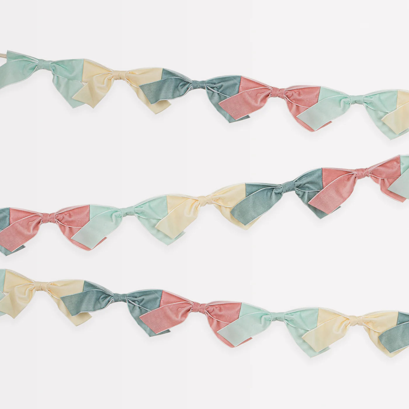 Bows are still having a moment! Our clever designers have made them big, bold, and beautiful in this gorgeous garland. Transform any party room into a spectacular setting in seconds by hanging it on the porch, in the doorway, on the wall or mantel, or draping it on the party table for a delightful effect. The bows are crafted from soft, luxurious velvet in perfect pastels, making them ideal for a baby shower, bridal shower, or any special celebration. The garland comes packed in an organdie drawstring bag, perfect for storage or as a fabulous gift