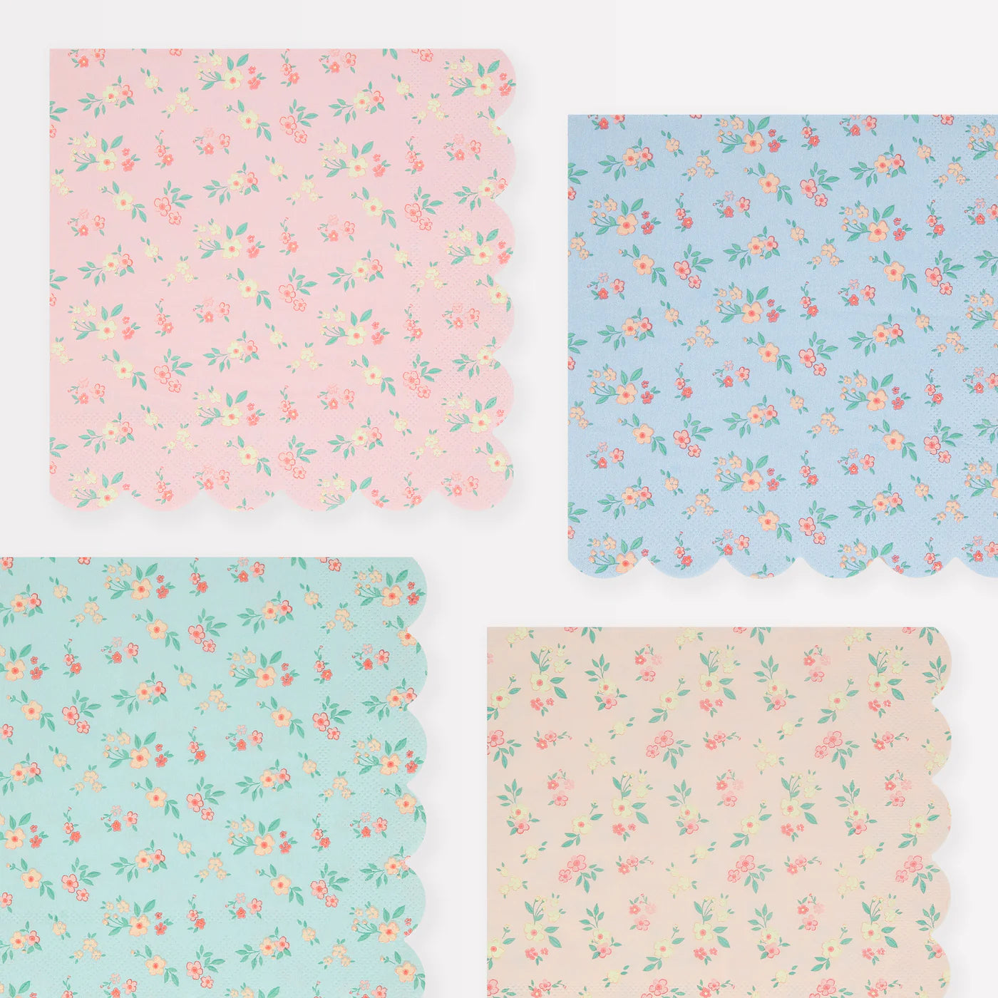 Ditsy floral clusters add effortless elegance to any setting. This classic design is influenced by fashion-forward floral pattern trends, with a scalloped border for a stylish look. The four different vintage colour ways, of pink, peach, mint and blue, in this large napkin set are perfect for afternoon tea, garden parties, bridal showers or baby showers
