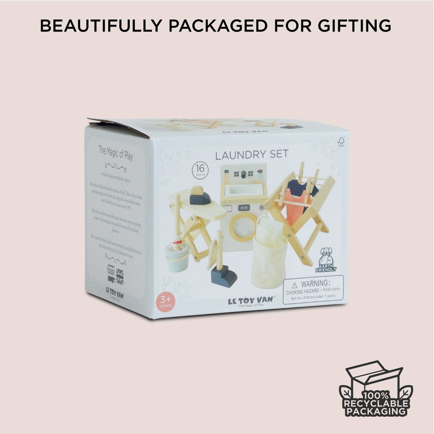 Washing tiny clothes just got a whole lot more fun with this sweet laundry room set. This delightful 16-piece toy makes a wonderful addition to small-world play. Comprising a washing machine, folding clothes drying rack, iron & folding ironing board, 4 miniature pegs, felt clothes, laundry basket, vacuum cleaner and mop & bucket. All featuring natural soft tones and lots of exposed wood. Compatible with all of our dolls, dolls houses and accessories.